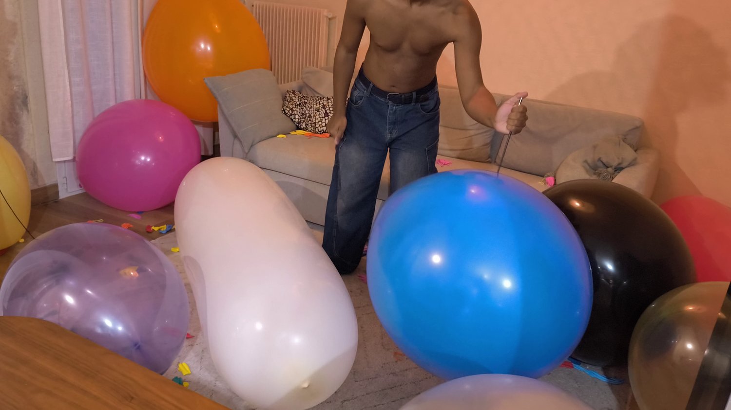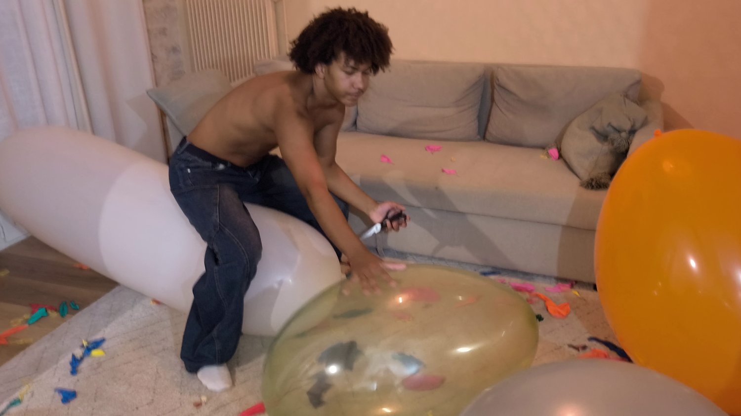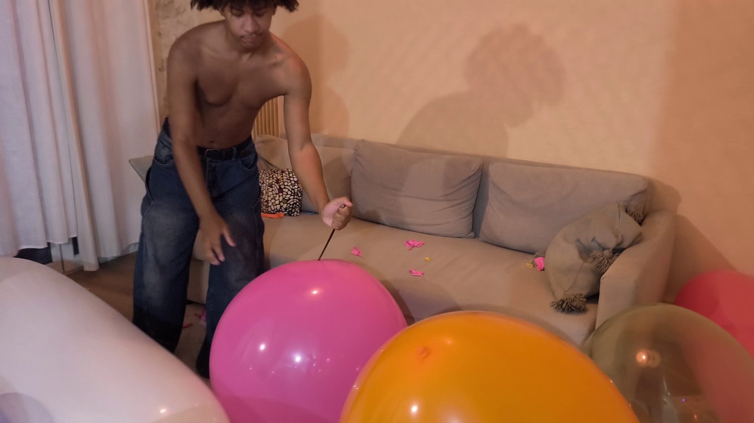 He starts by trying to pop them with a chopstick and finally takes a pair of scissors.