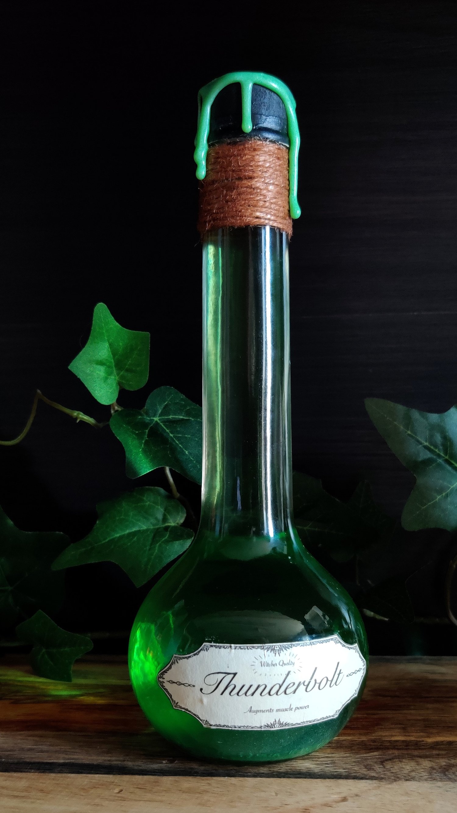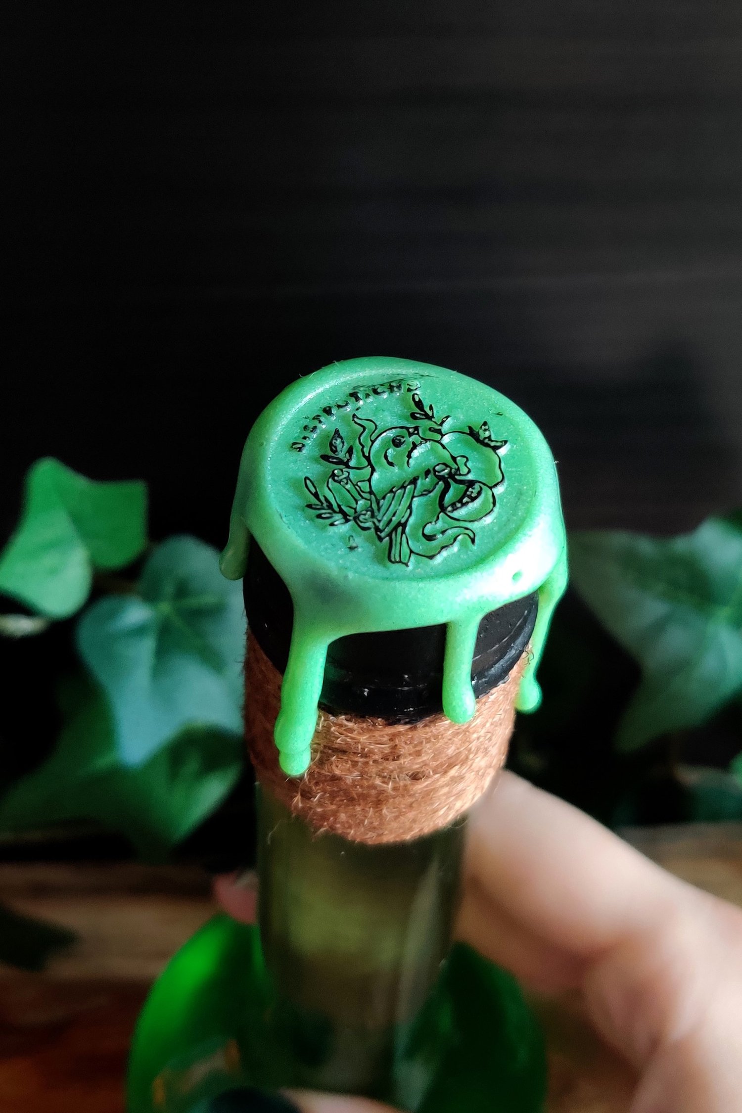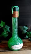 Pullossa on vihreää nestettä ja se on koristeltu käsintehdyllä etiketillä, juuttinarulla ja sinetillä.