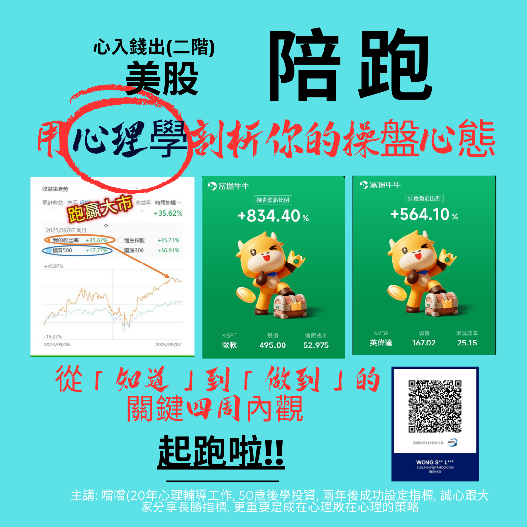 本課程及相關分享會內容不構成任何投資建議。投資具有風險,過去表現不保證未來結果。參與課程前,請自行評估個人財務狀況及風險承受能力,並在必要時諮詢專業財務顧問。本課程僅從教育及心理學角度提供資訊,不應視為個人投資指導或推薦。