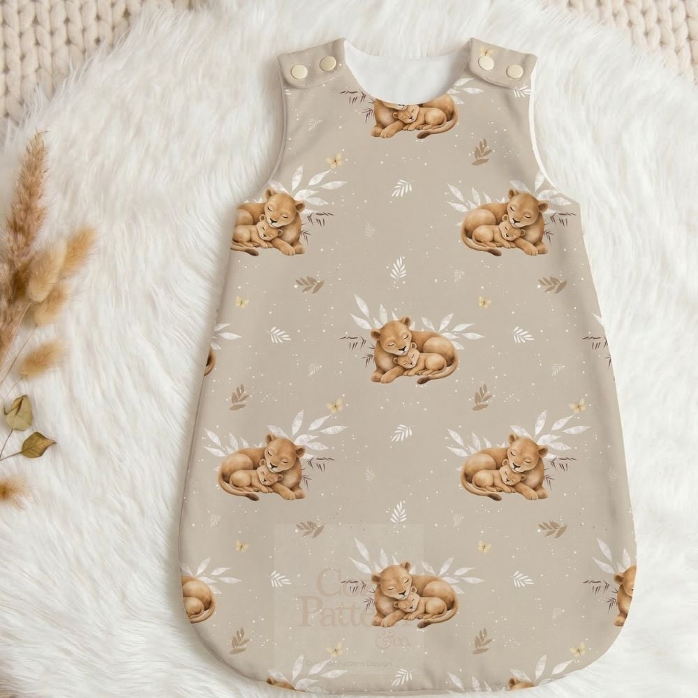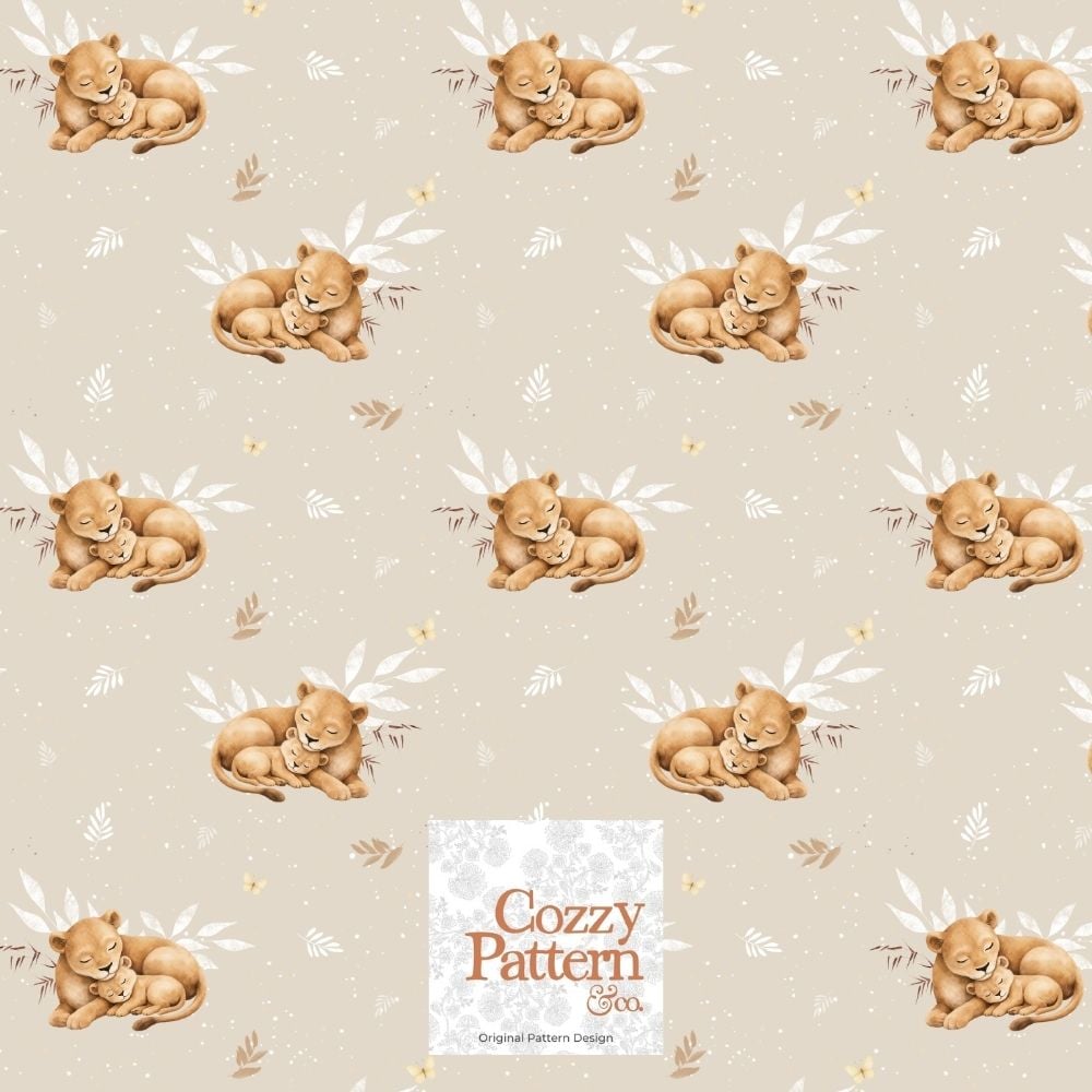 Create adorable baby and nursery projects with this sleeping lion cub seamless pattern, a soft safari-inspired design featuring a mother lion cuddling her baby surrounded by delicate leaves, butterflies and subtle botanical elements.