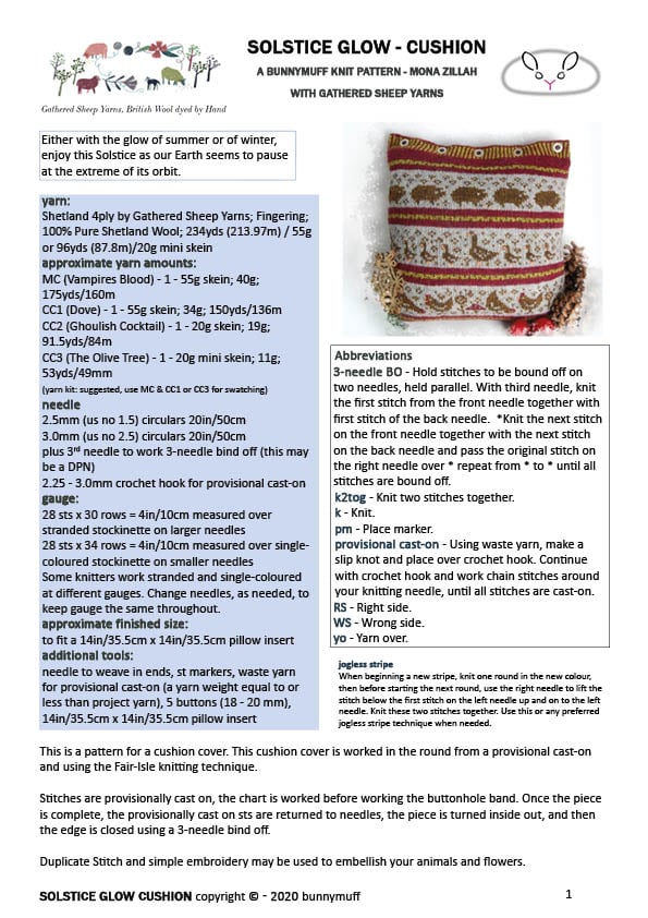 This is a pattern for a cushion cover. This cushion cover is worked in the round from a provisional cast-on and using the Fair-Isle knitting technique.