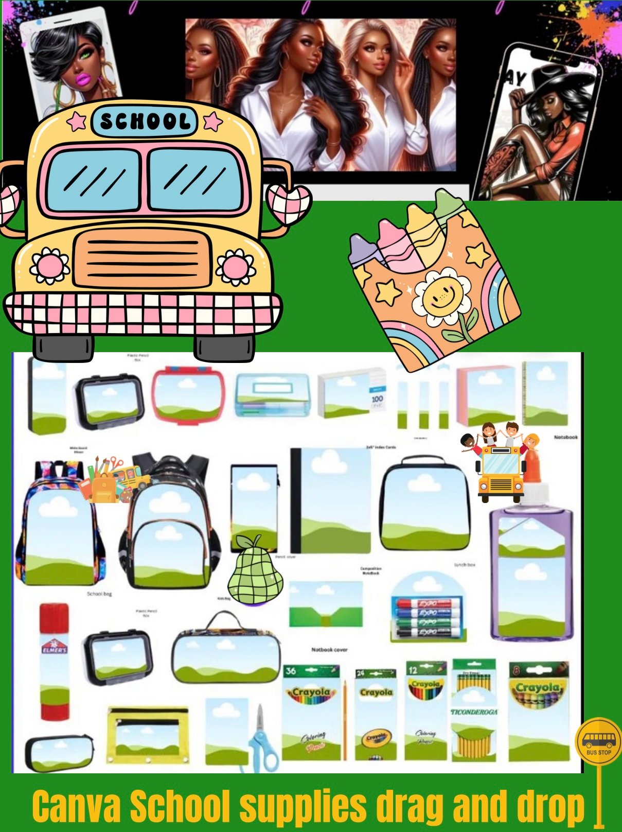 All School Supply Mockup Template Bundle, Drag And Drop, Back To School Bundle,Notebook,Tumbler Mockup,Crayon Box Mockup,Geometry,School Bag and more all school items needed use Canva to drag and drop pro account not needed add your image print and done