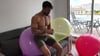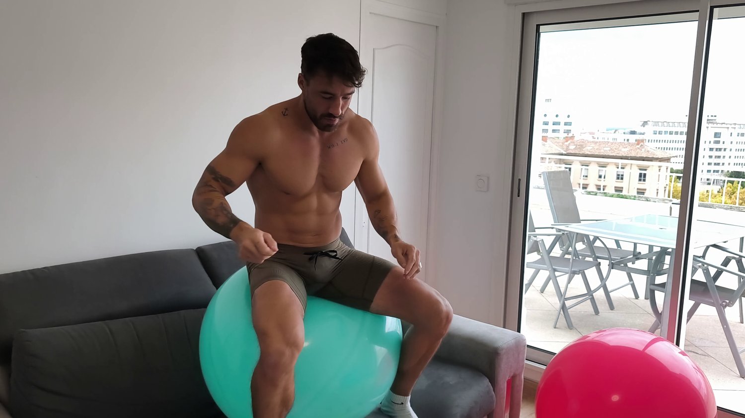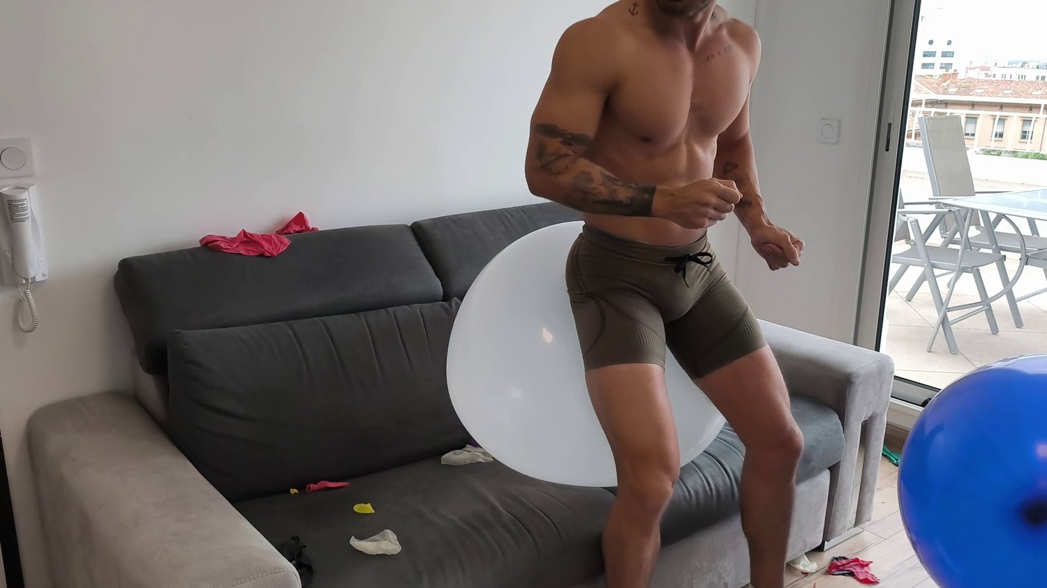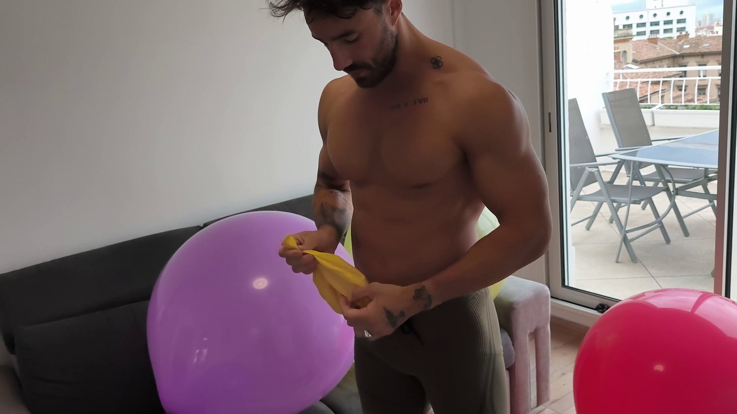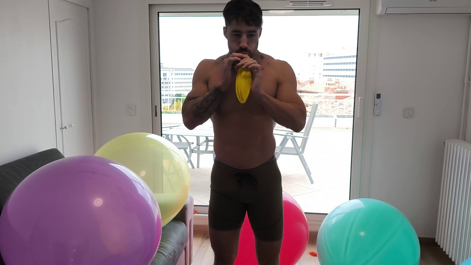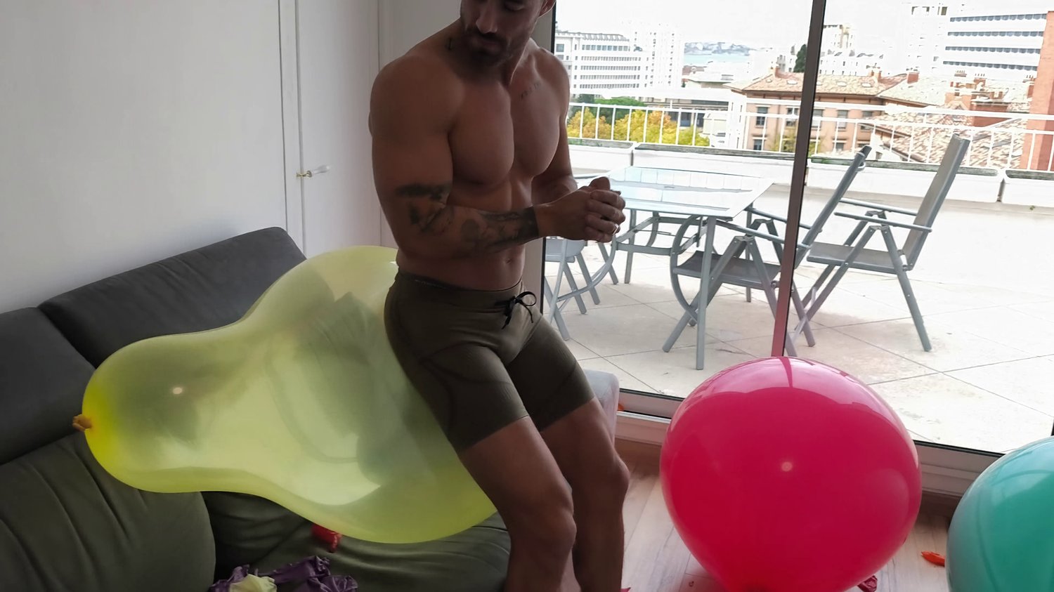After that, he pops giant balloons by jumping on them, sitting on them, and using a knife when a balloon don't want to pop.
