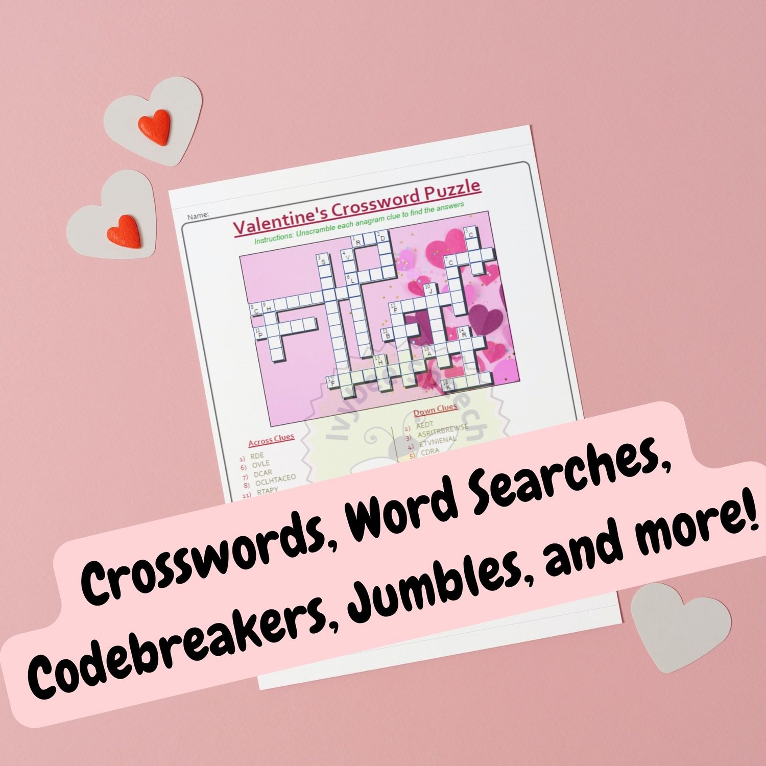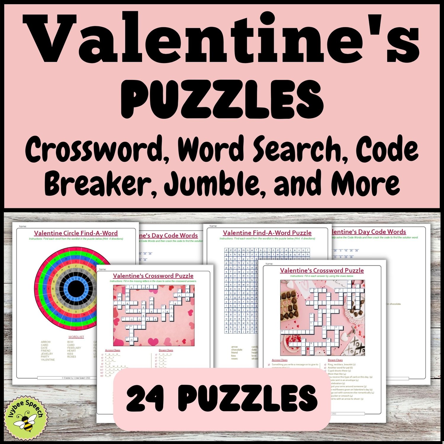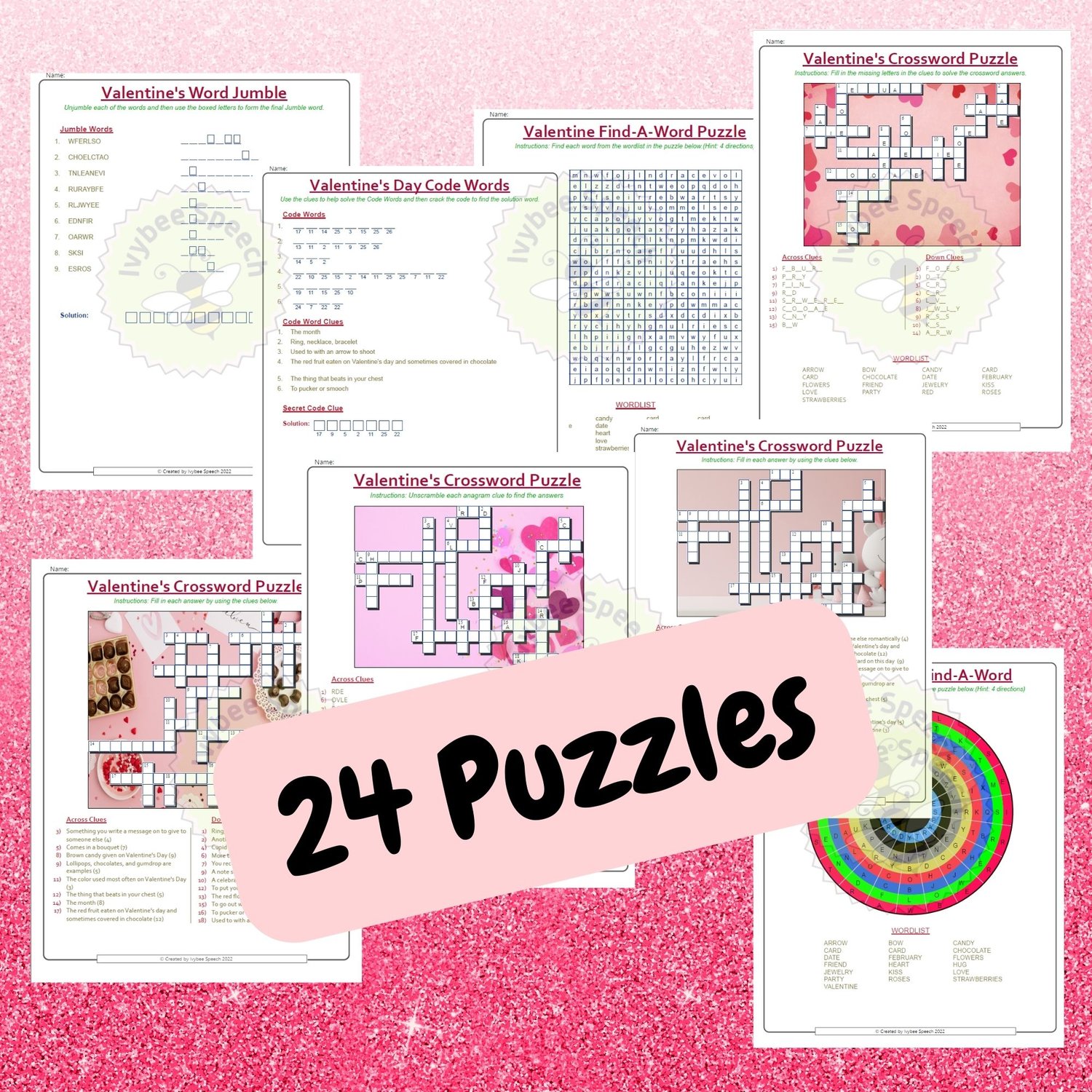 What's Included: ❤️3 Crossword Puzzles ❤️3 Clueless Crossword Puzzles ❤️2 Communicative Crossword Puzzles ❤️1 Mystery Crossword Puzzle ❤️1 Anagram Crossword Puzzle ❤️1 No-Peeky Crossword Puzzles ❤️1 Circle Find-a-Word Puzzles ❤️2 Find-a-Word Puzzles ❤️4 Clue Jumbles ❤️1 Word Jumbles ❤️5 Code Word Puzzles 🔑Answer Keys and Instructions for All Puzzles