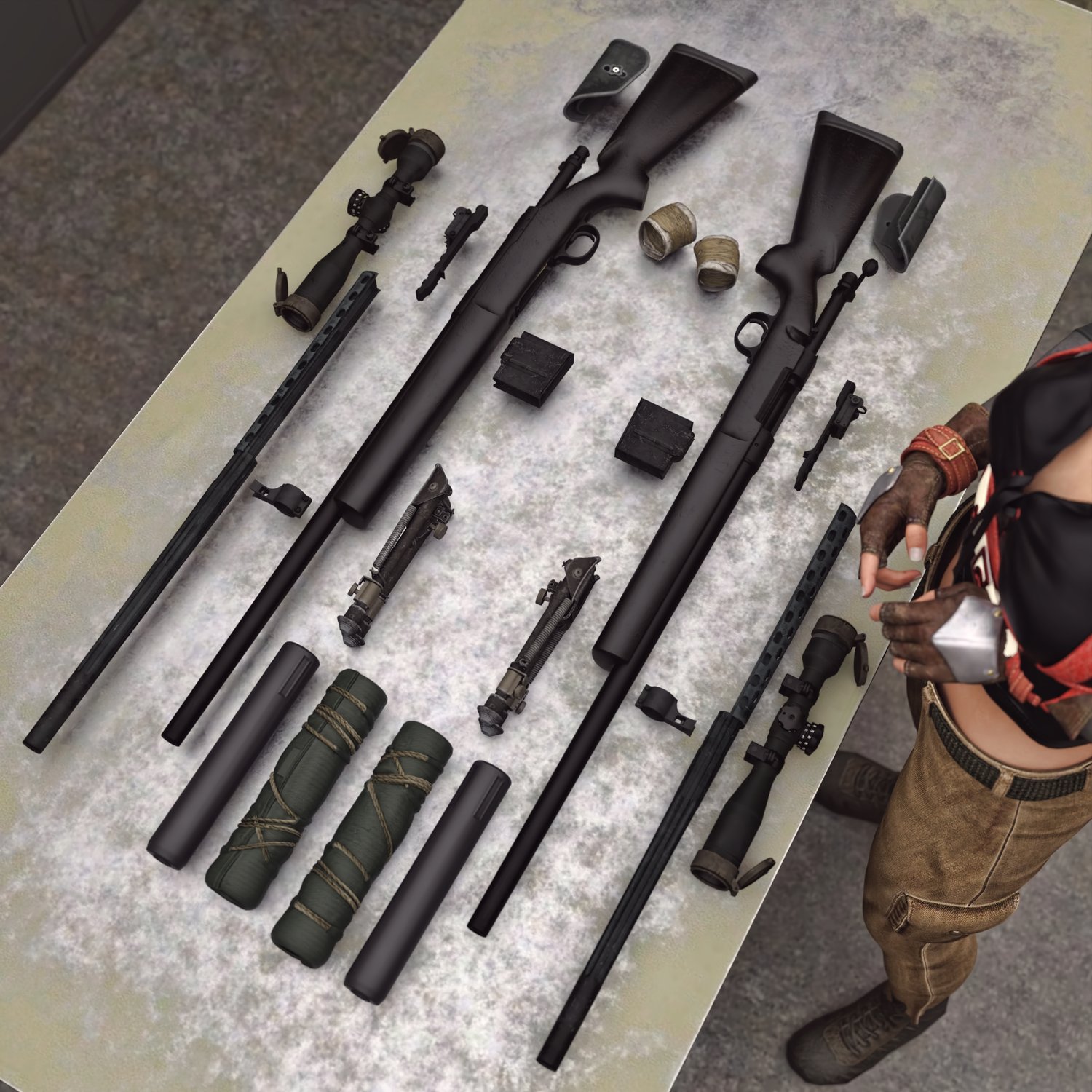Very famous and kinda classic sniper rifle. Used both in military and in hunting, provides great precision and performance. Rigged and converted for use with DAZ. Good power and looks in the modern fashion. The prop has multiple parts so you can customize it as you wish, from the simple configuration to a silenced postap sniper rifle. Also includes iron sights, just because :D Can be used with a mag or without (there is a rigged bullet cover on the bottom). Trigger, safety, bolt, etc also rigged for more realistic pictures. Includes a silencer, optics and bipod, 2 barrels, iron sights and more, for various porpoises and pictures.