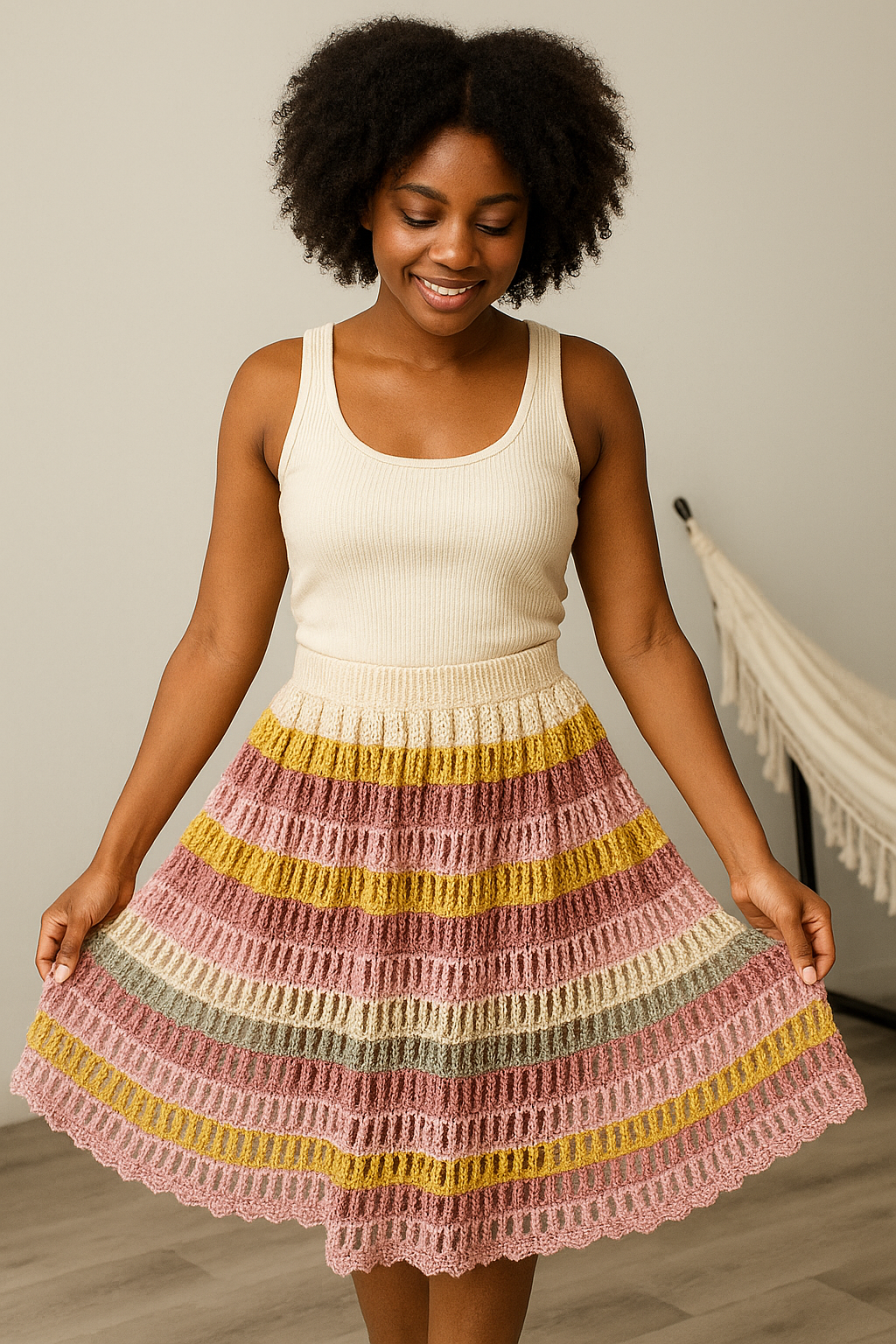 This digital PDF is a full, step-by-step written pattern inspired by the viral TikTok skirt designed by Tricera Crochet. Perfect for summer days, festivals, or just spinning around, the Super Spinny Skirt features a lightweight drape, vibrant color stripes, and amazing movement.