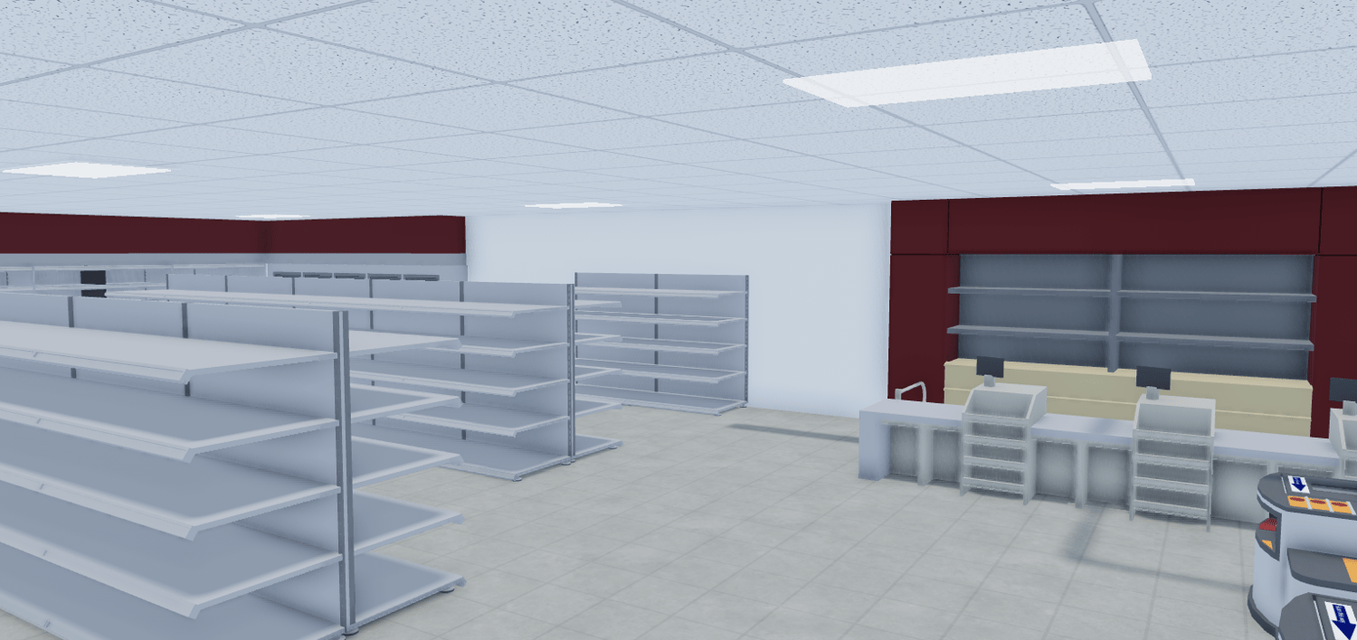 Local supermarket store, new build design with full interior. Has a back door for deliveries.