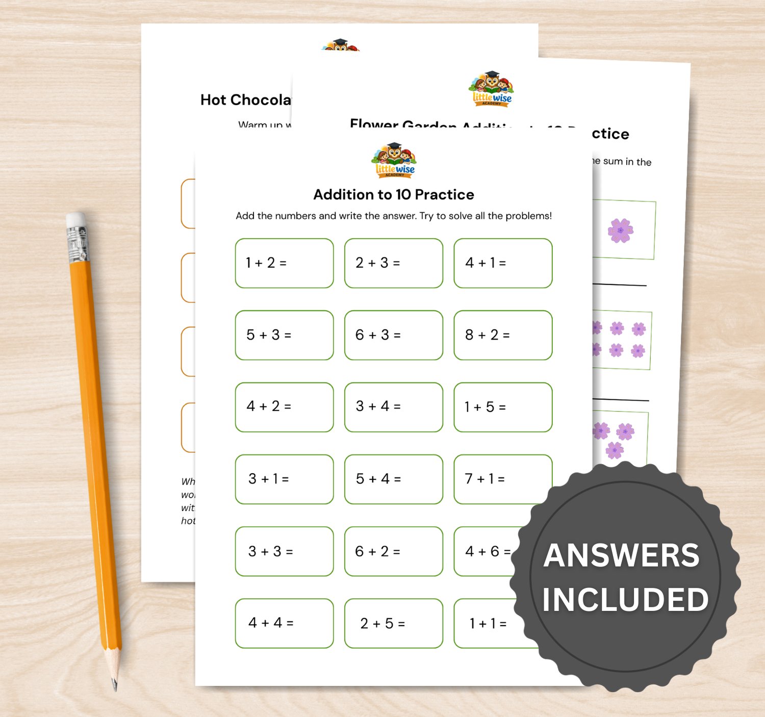 Provide your child with a strong foundation in mathematics using our Addition to 10 Worksheets. These are ideal for reinforcing early number concepts and can be used for regular practice, whether daily or weekly.