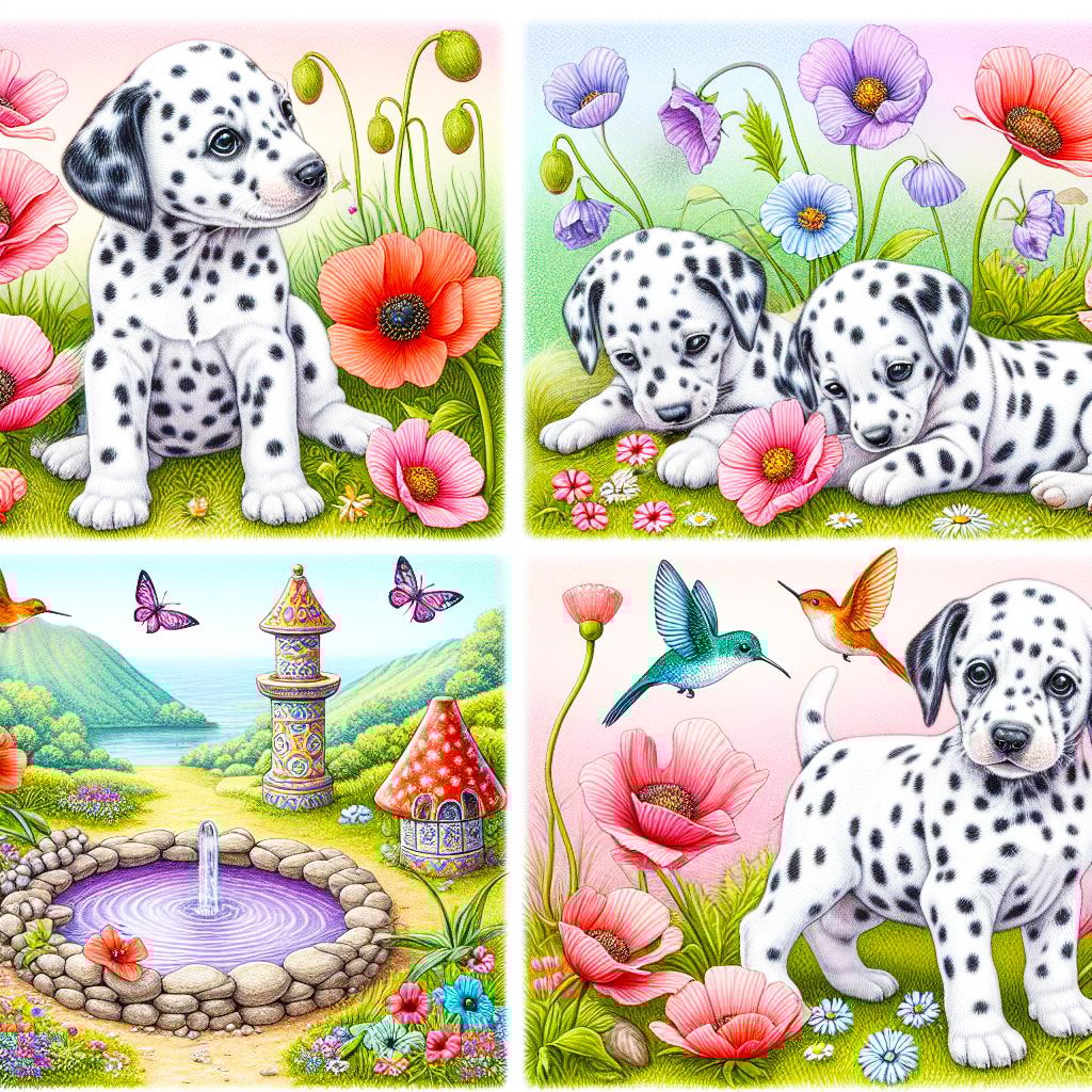 Dalmatian puppies snuggling together on a hill with poppies, daisies, & toadstools. There is a purple pond with a water fountain & a wishing well with patterned tiles. There are bright humming birds.