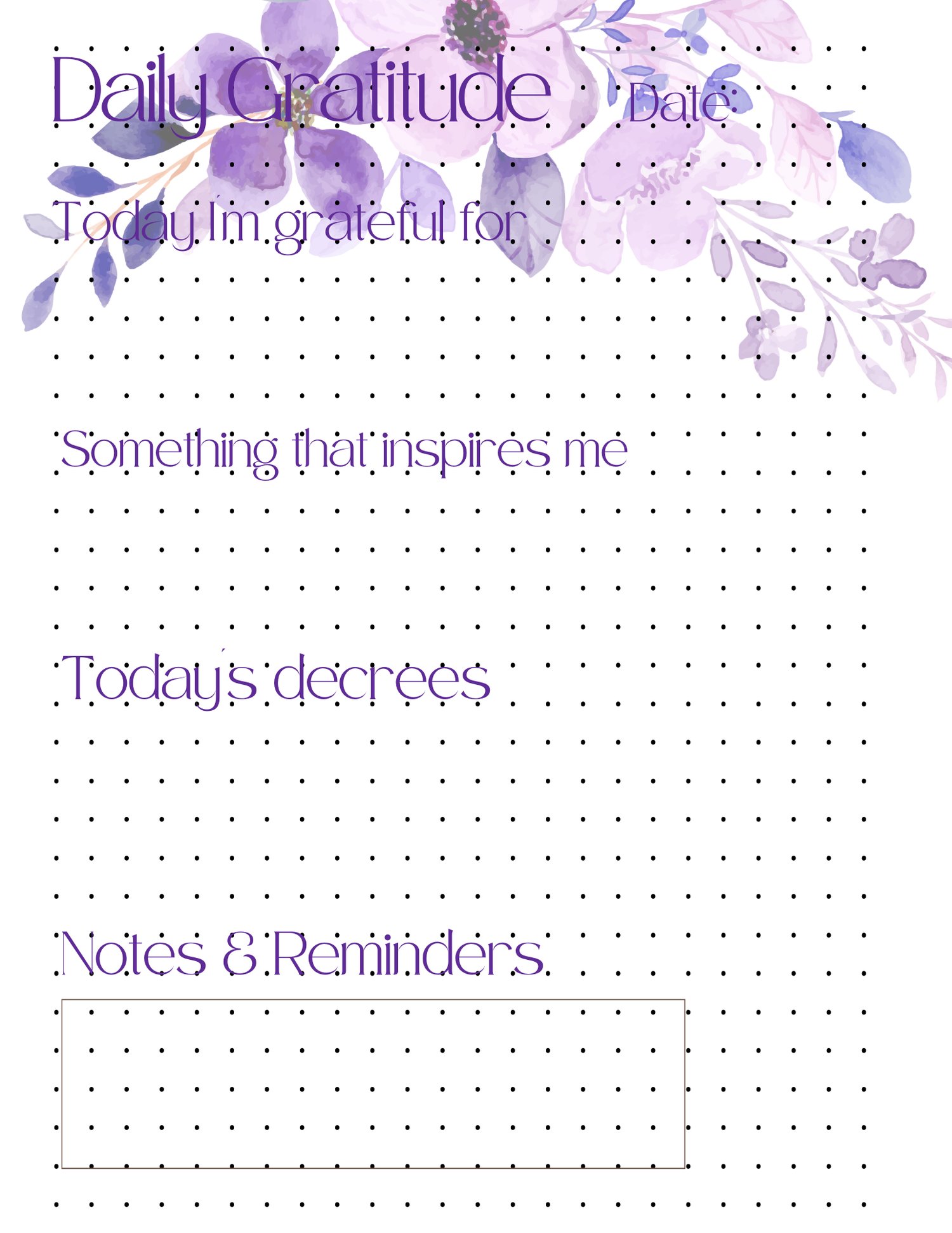 - Space for gratitude, inspiration, daily decrees, notes, and reminders