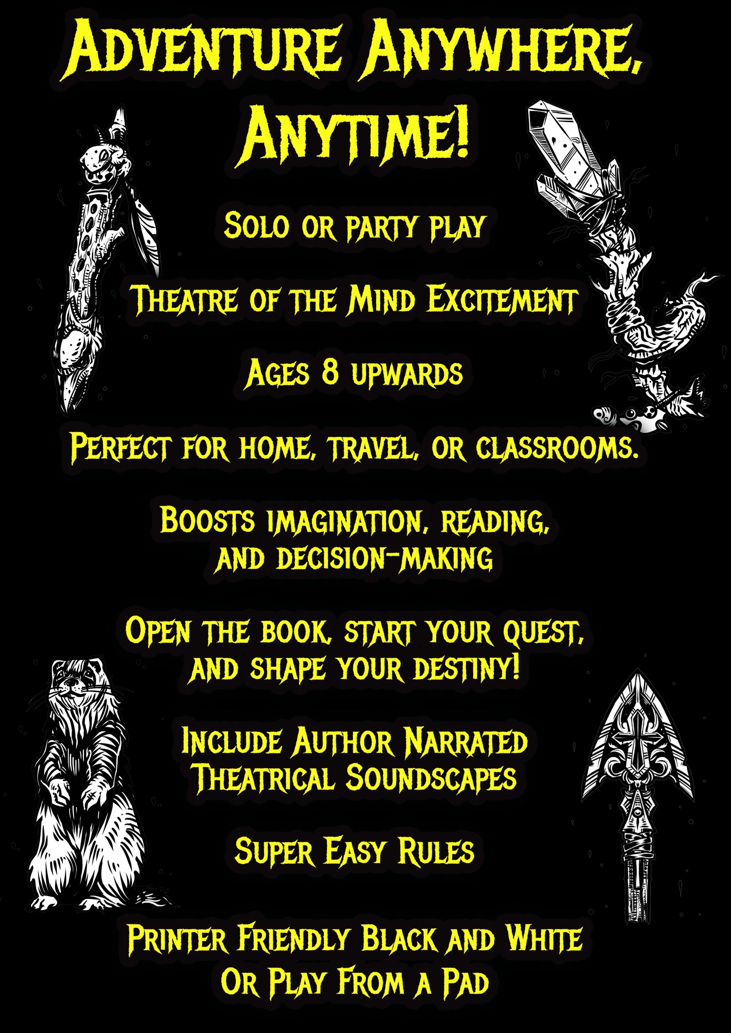 This game has been designed to allow anyone to go on an adventure anywhere, at any time. Whether on a train, bus, camping or during a lunch break, you can open this book and enter a virtual world of adventure, one set in your mind's eye. It can also be played with friends, family or solo, regardless of whether they have played a game like this. There is even the opportunity to play with even more players in the Party Play mode. With multiple choices and random elements, you can make each time you play it different from before.