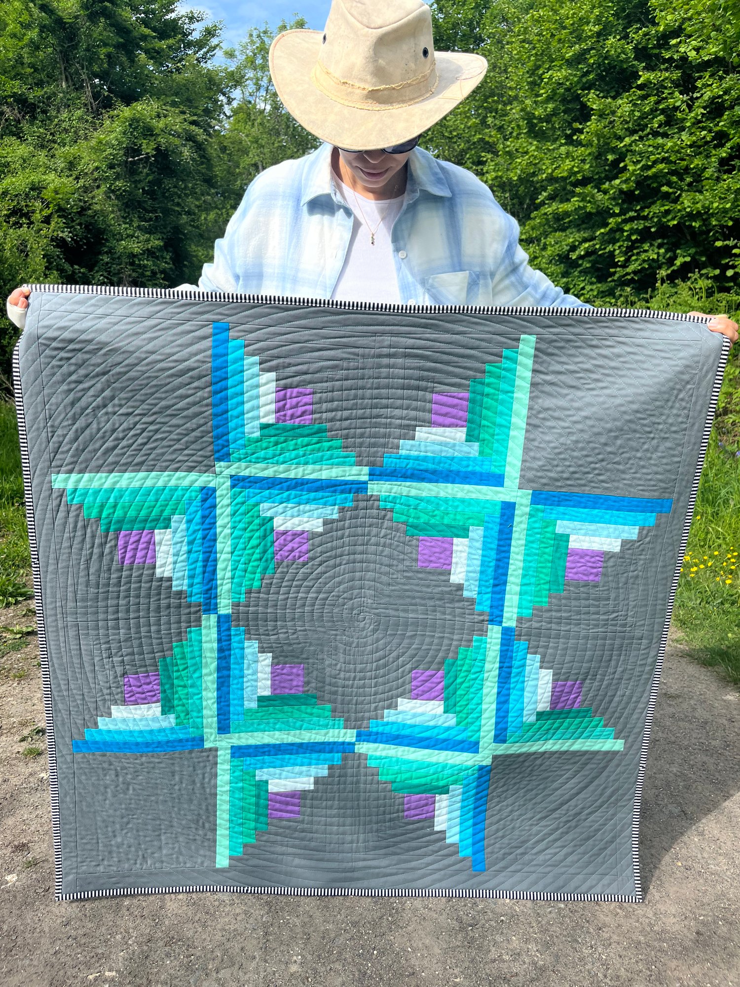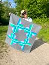 This baby-size quilt features a modern star design in cool tones of teal, aqua, purple, and blue against a soft grey background. Made from high-quality cotton, it's soft, durable, and gentle on baby’s skin. The quilt's back has a light pattern that complements the bold front, and the striped binding adds a neat finish.