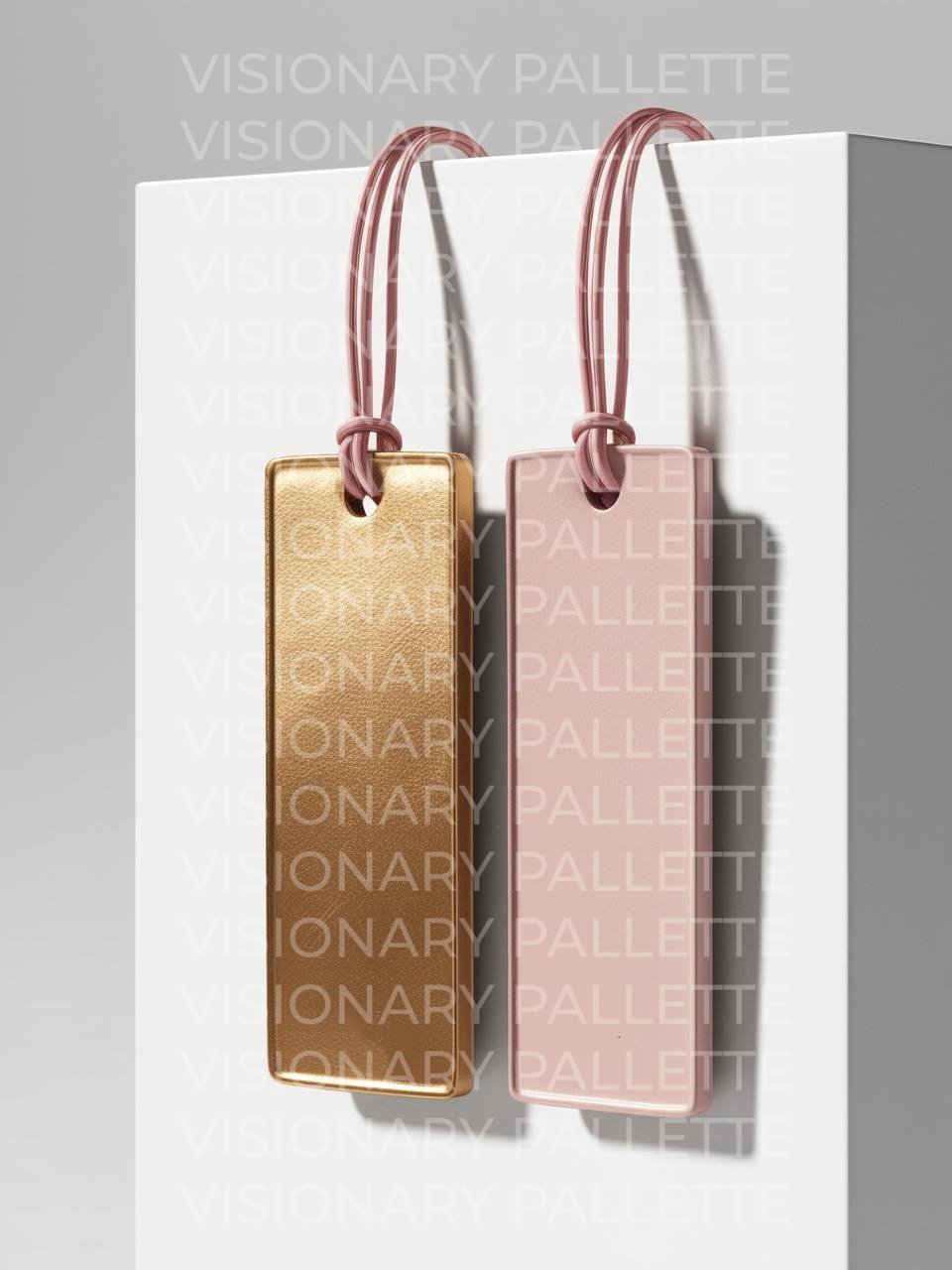 A realistic gold and pink vertical rectangle hair hang tags with a pink string through the hole