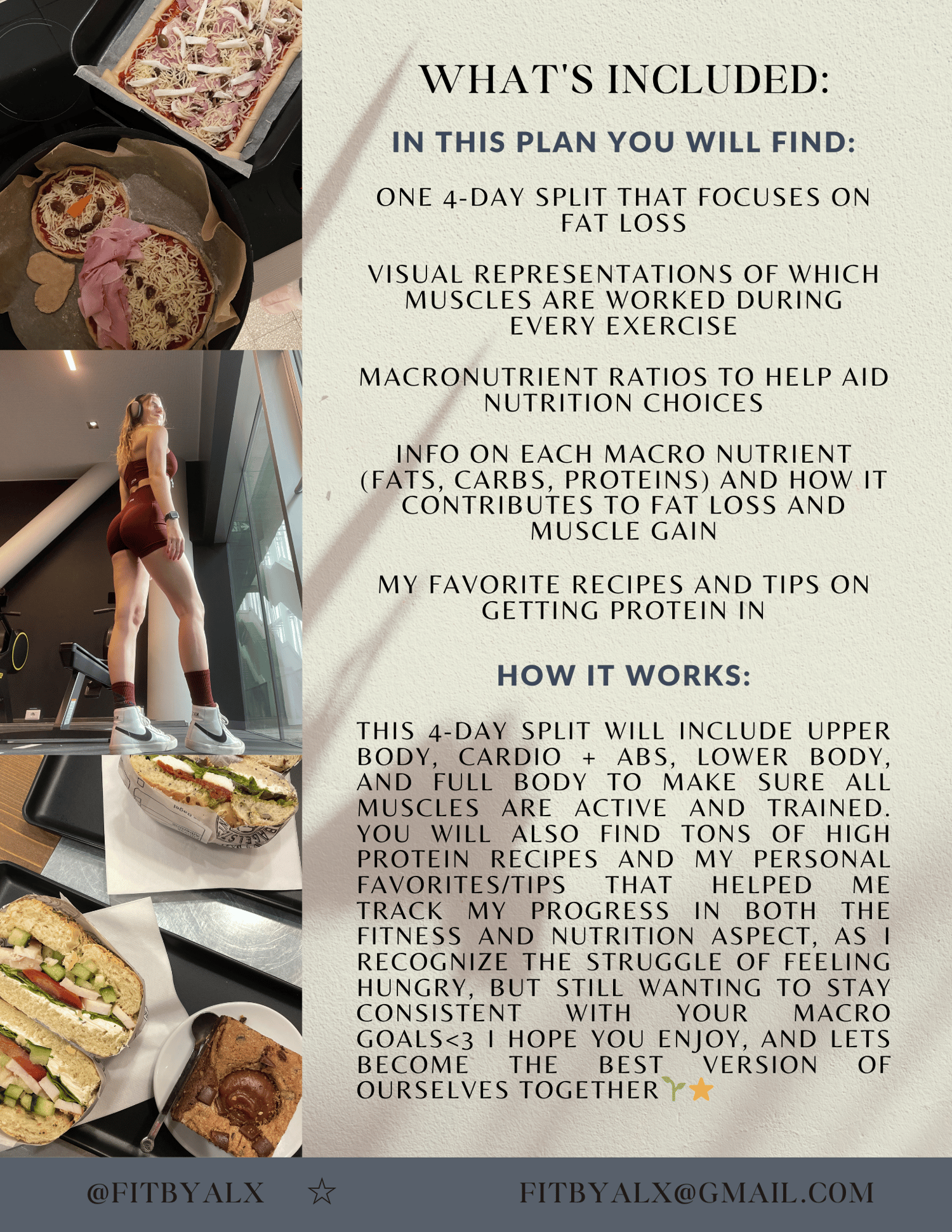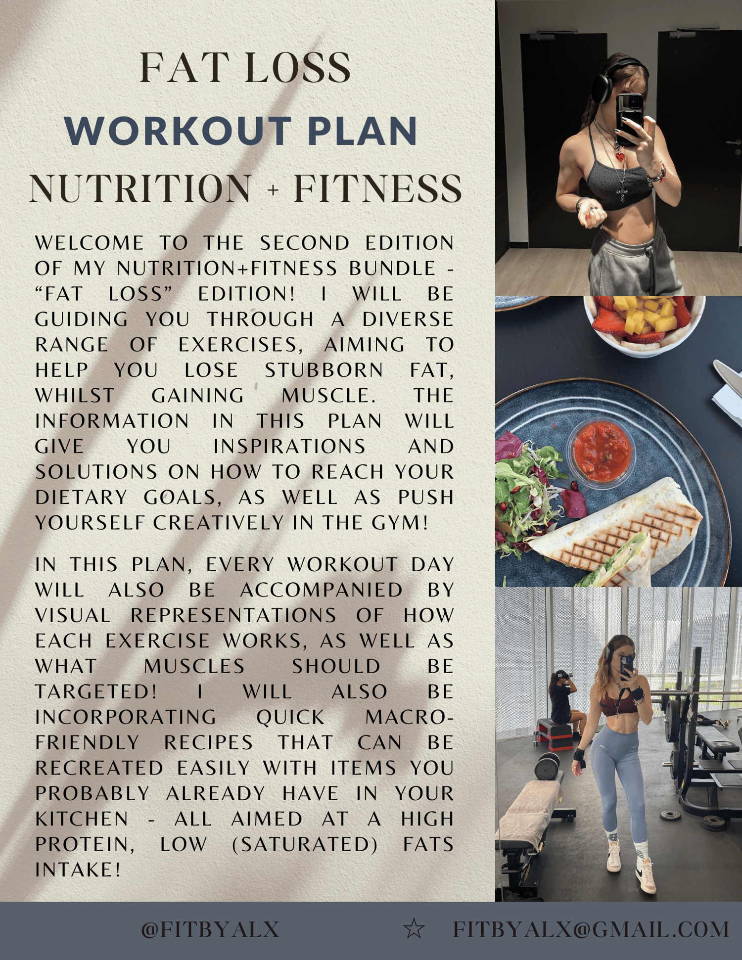 Welcome to the second addition to my Nutrition + Fitness Bundle - Fat Loss edition! If you struggle with cravings and sticking to your meal plans, and are not sure on the proper way to train your body with this goal in mind, then this program is for you! With this bundle, you will get a full, 4-day split targeting all the main muscles, visual aid beside them, as well as a mini cookbook of high-protein, low calorie recipes that can be easily recreated with products you most likely already have at home! I also included a section about my top recommendations on how I found easiest to track both my fitness and nutrition progress, as well as some quick, low-calorie snack ideas that keep me full throughout the day and contribute to my protein goal, as I think we all know that struggle:,). I hope you enjoy,, let's get strong together!