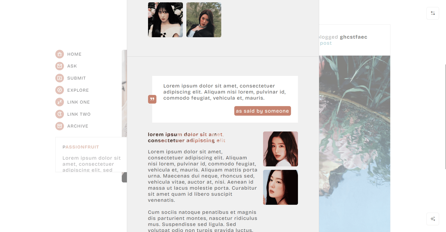 features: 200x380px sidebar image, blog title, seven custom links, 550x180px modal header image, six default 100x100px icon images, about section: about quote section, about title with image as background of the text, about section, two default 100x100px about icon image, socials section, 550x100px footer image with text, 450px to 540px text posts