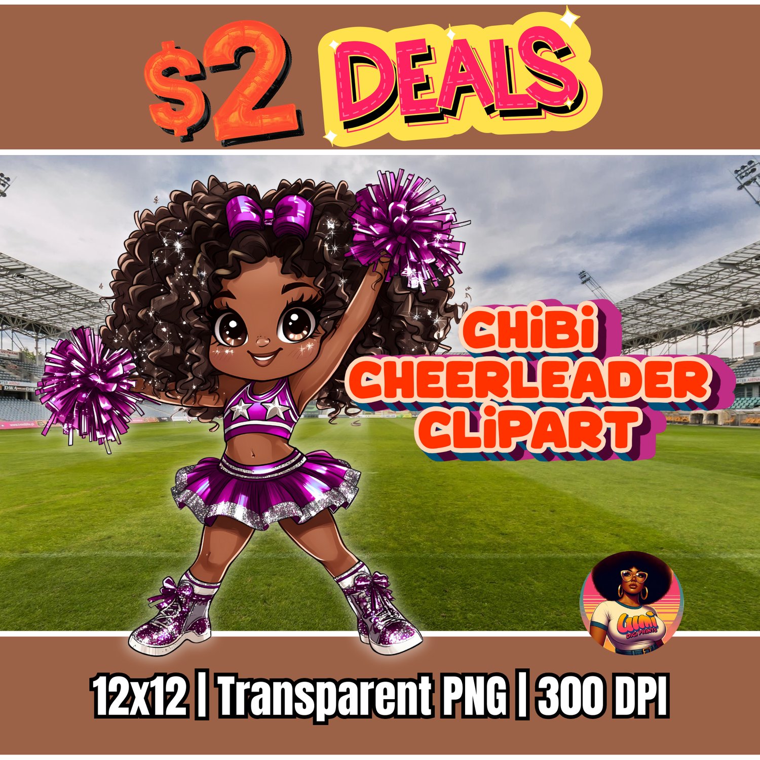 Get ready to dazzle with this chibi cheerleader girl in a sparkling purple uniform. This high-quality clipart is an absolute must-have for crafters, parents, and coaches looking to create vibrant, high-energy designs. She's the perfect mascot for any team that proudly wears purple and silver!