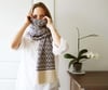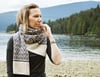 Inlet Scarf has a simple construction consisting of two end panels in solid colour and middle section knit with two colours in mosaic knitting technique. Generously sized to wrap around the neck twice, it is an ultimate cozy piece to be worn for a walk in downtown or an evening in the cabin.