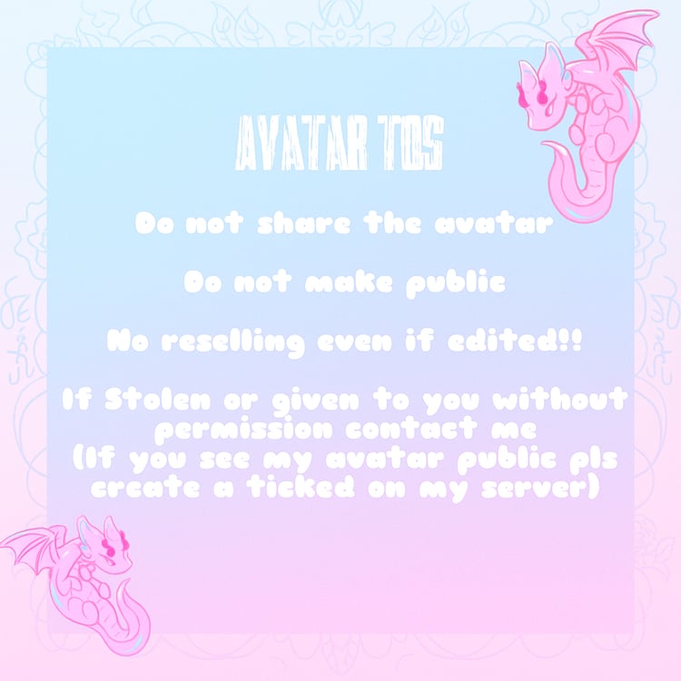 - By purchasing this item you agree to the tos and follow the terms of service. breaking the rules sadly gets you blacklisted and banned from getting my avatars. You will be asked to cease and remove as well.