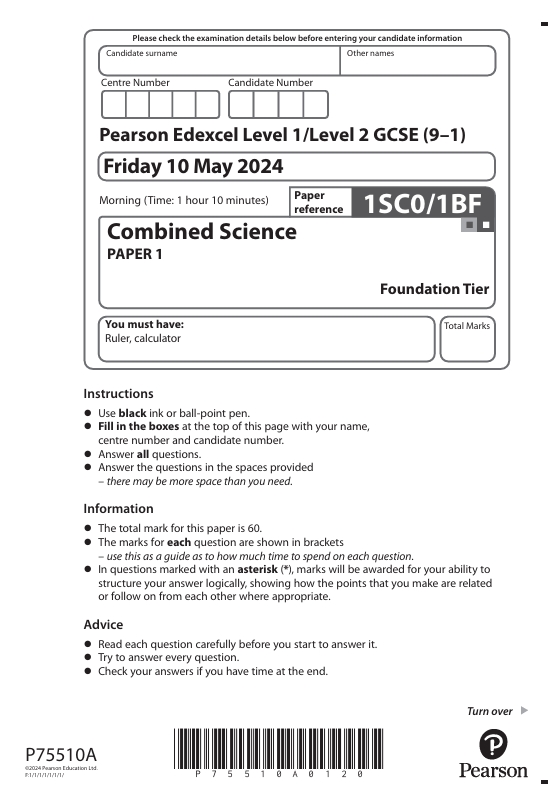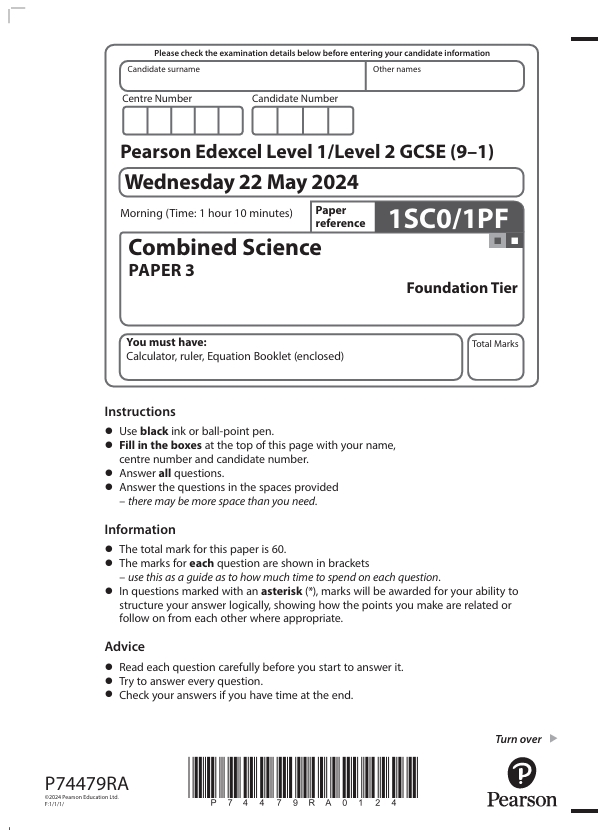 GCSE Edexcel June 2024 Foundation Combined Science Papers Bundle (1/2BF, 1/2CF, 1/2PF with Mark Schemes)