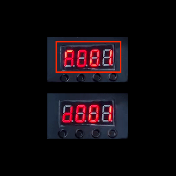 * En el modo "A001" (con "A") verifique que coincidan estos canales: 1 Dimmer, 4 Azul, 5 Strobo.