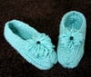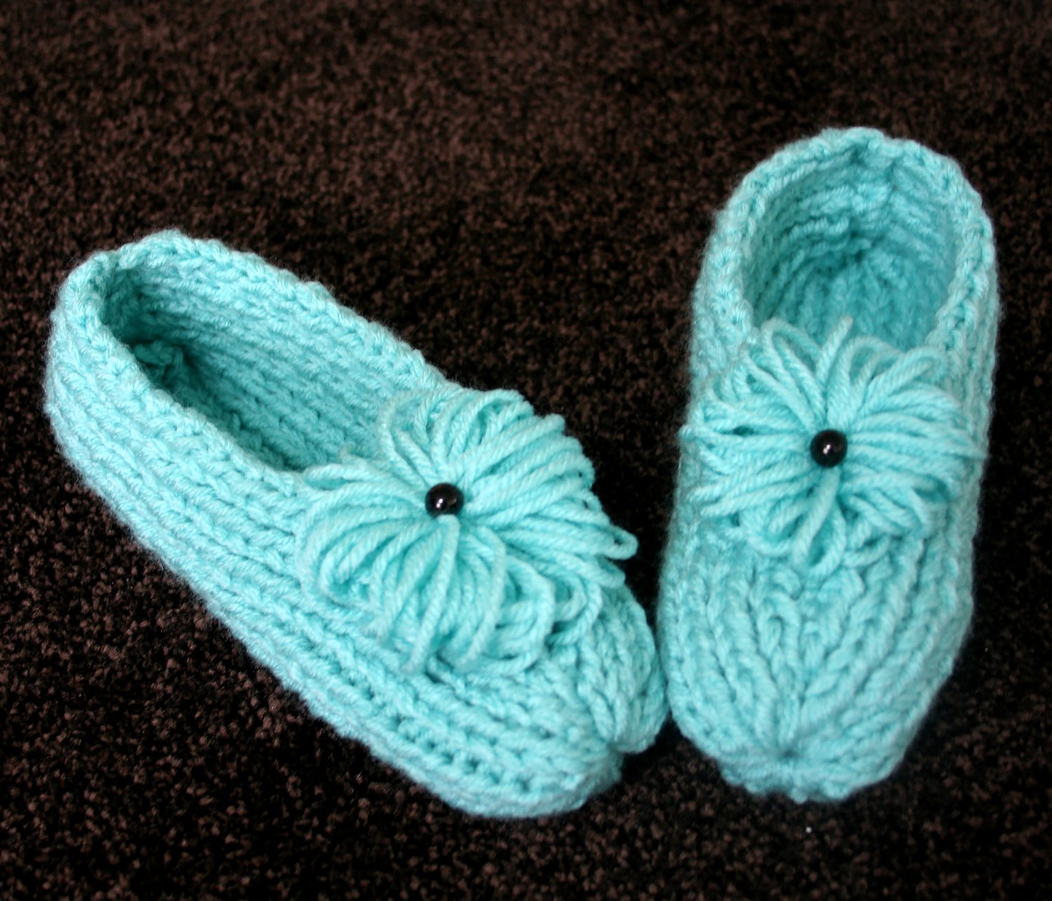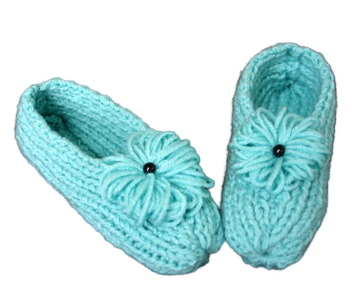 This is my newest knitting project. I came up with this cute pattern for cozy and warm slippers. They hug your feet so nicely and keep you nice and warm on chilly days and nights. These slippers are knitted with double yarn so they are durable, and they are a light teal color. But you can use any color you like. Fits woman's foot size 6 to 8.