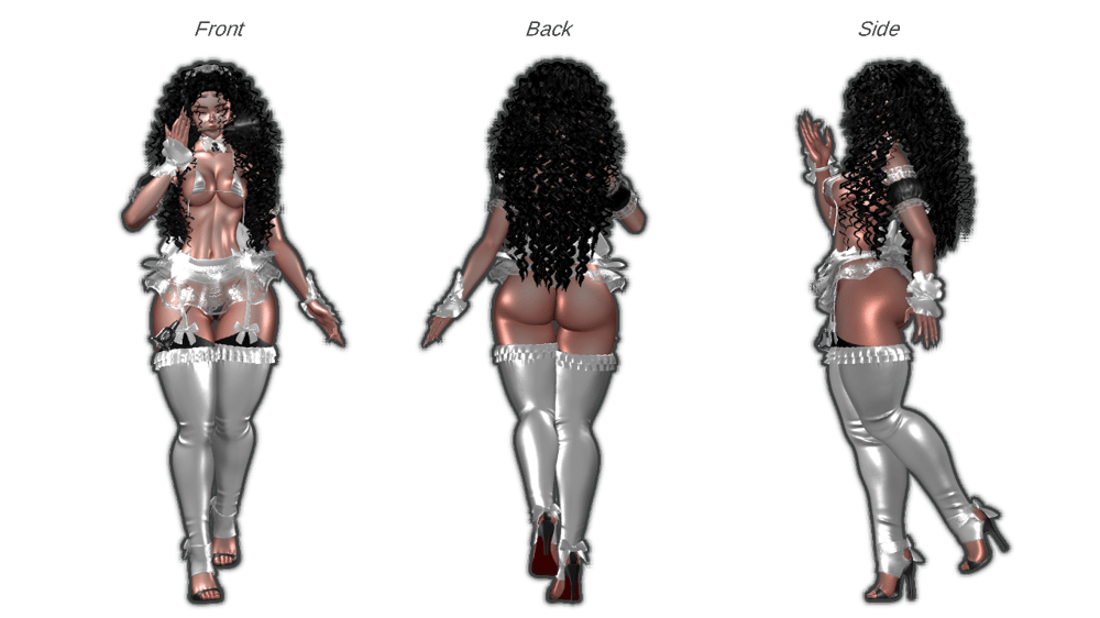 Hair 1, Hair 2, Hair 3 Hair 4 Maid Outfit 1, Maid Outfit 2, Shorts, Glasses, Crop Top, Bikini Outfit, Chair, Pole(Me), Feathers.