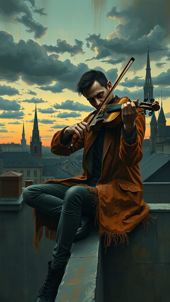 Vienna Rooftop Violinist in Cubist Expressionist Style