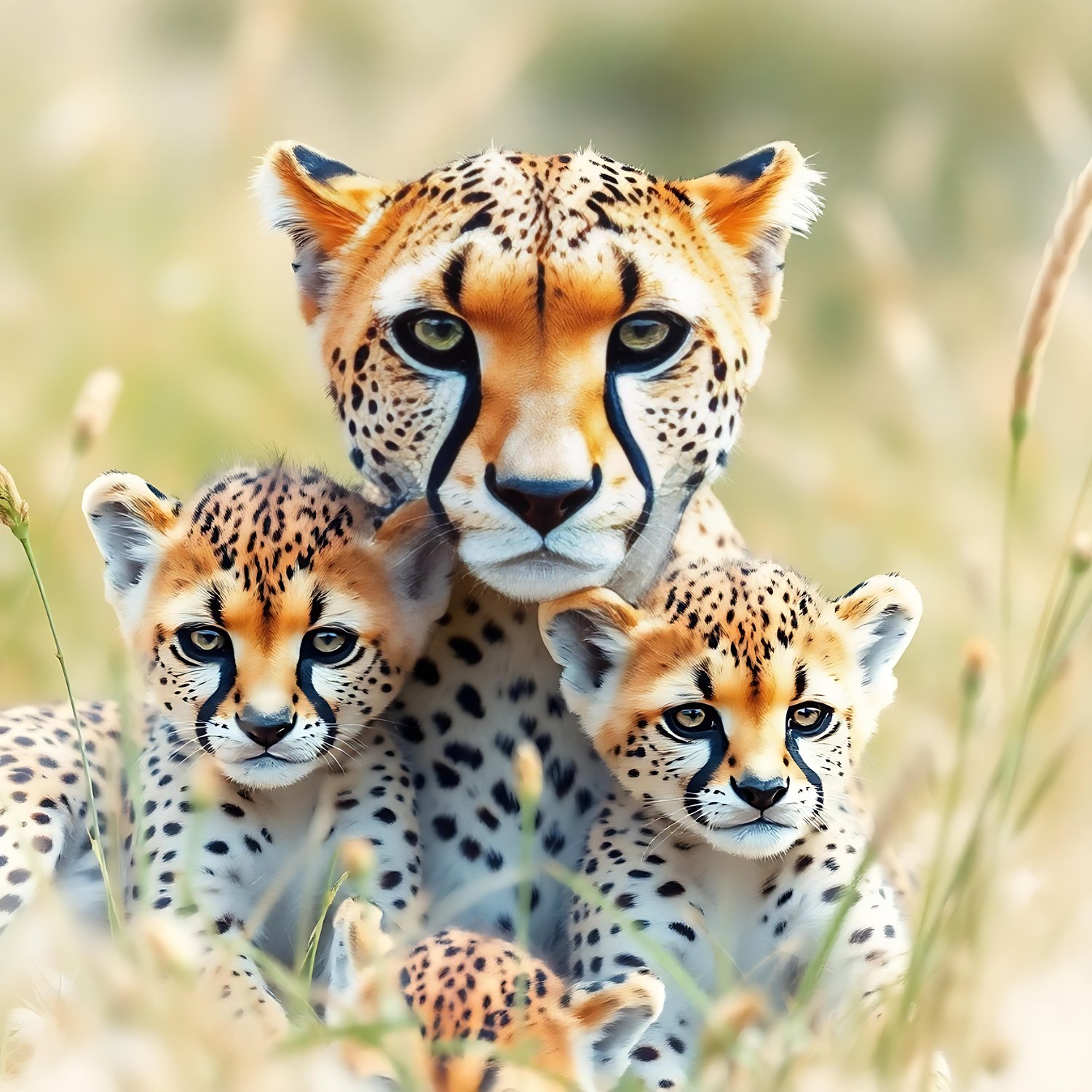 This beautiful photograph captured a cheetah with her cubs. The photograph will be printed on Hahnemühle gallery fine print paper. The size is A2 (420mm x 594mm)