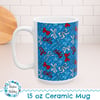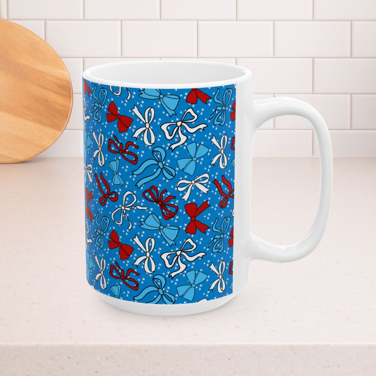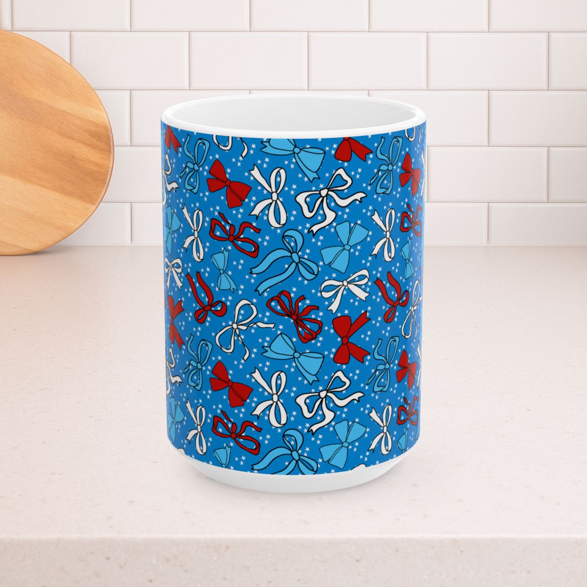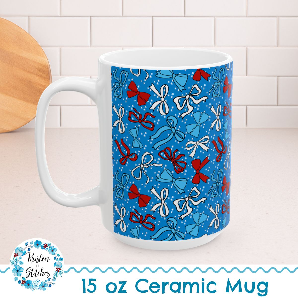 Patriotic Bows 15oz Ceramic Mug, Large Coffee Cup, Red White and Blue