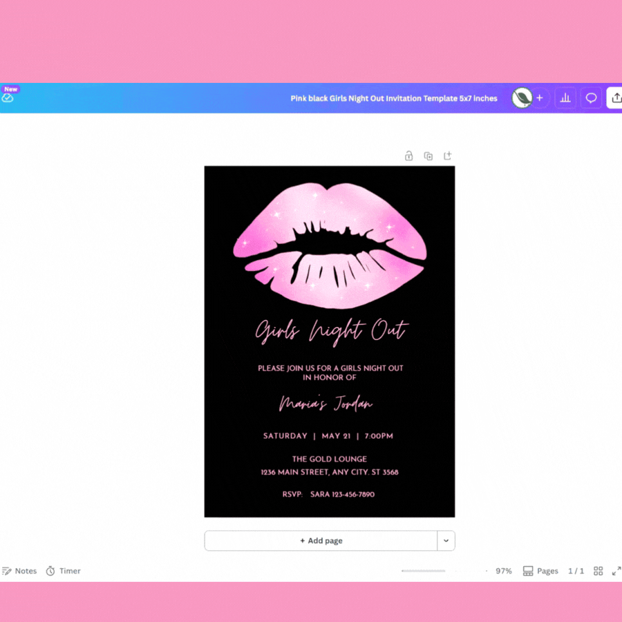 Plan the perfect night with this editable girls night out invitation template, featuring a stylish pink lips design for a fun and glamorous celebration. Perfect for ladies night, birthdays, bachelorette parties, or girls night in, this digital invite is easy to customize in Canva—no design skills needed. Simply edit your details in minutes, download instantly, Print it or send your invitation by text message, email, or social media for a quick and stress-free party setup.
