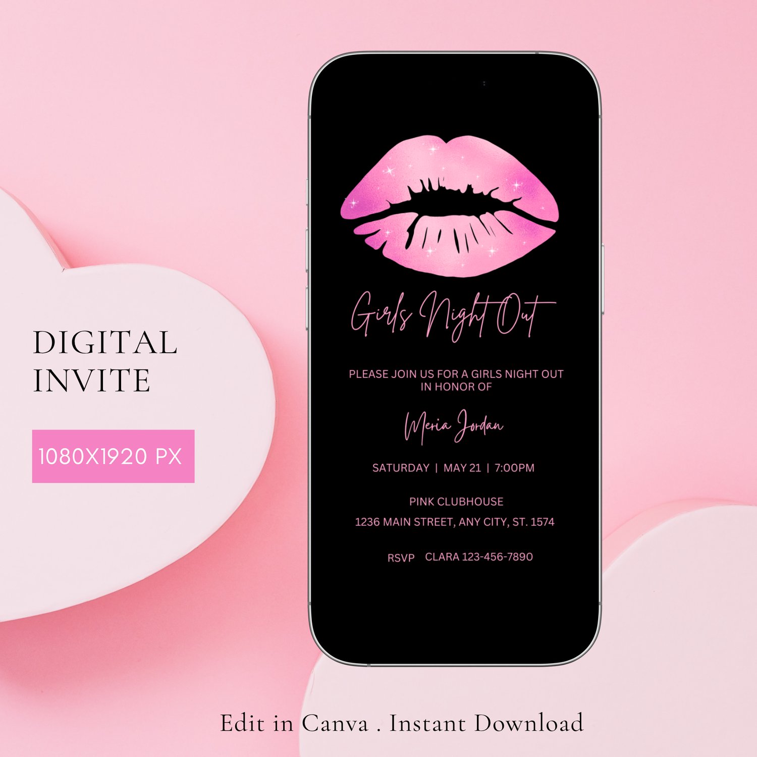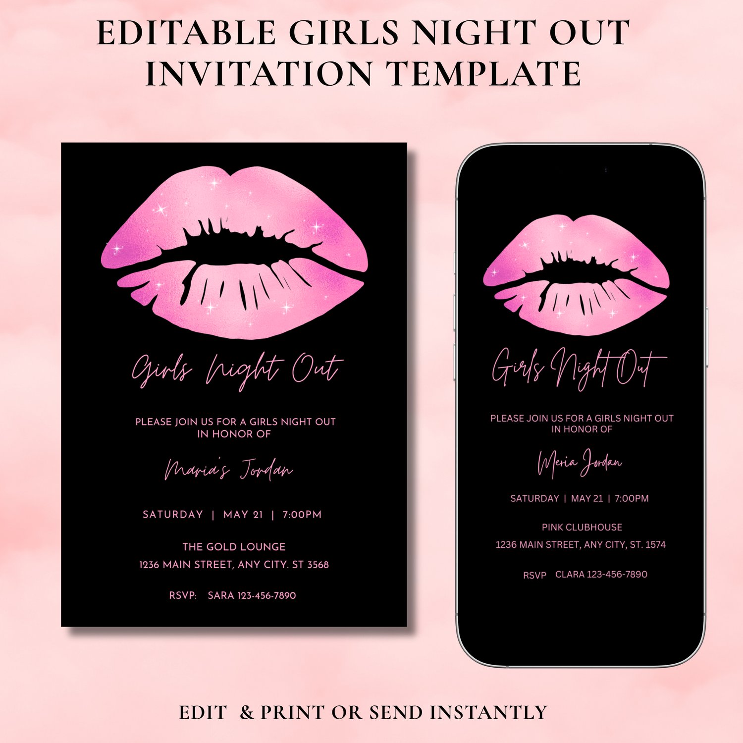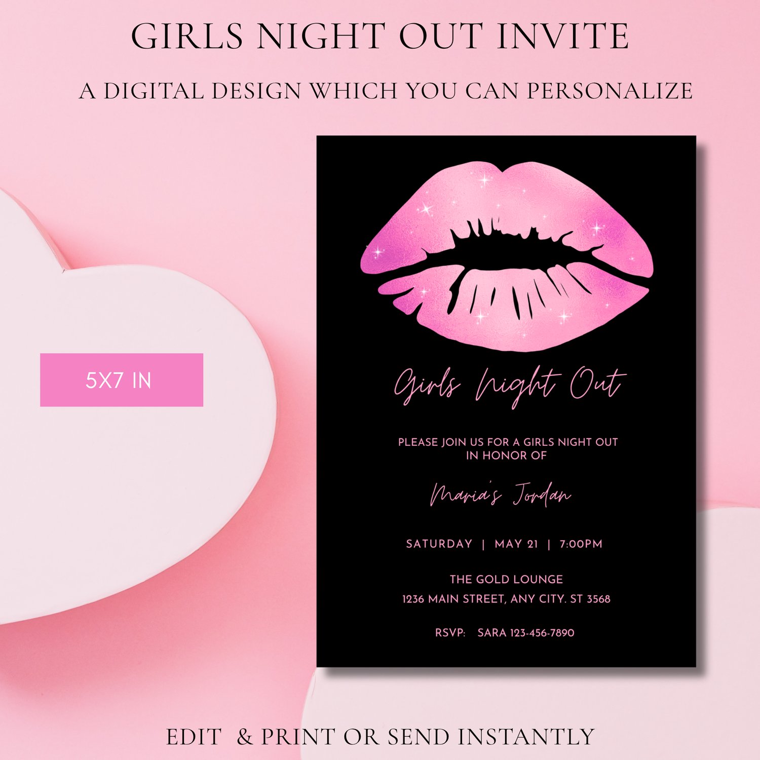 Editable Girls Night Invitation | Pink Lips Party Invite | Ladies Night, Bachelorette, Birthday Evite | Canva Template | Printable or Digital invite|