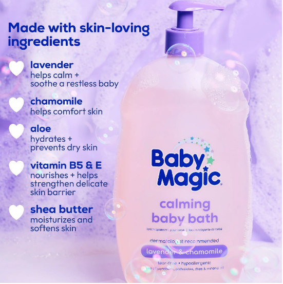 Baby Magic Calming Baby Bath help make bedtimes a magical experience. This gentle bath wash cleanses and helps calm your baby before bed. With naturally skin-loving ingredients, this hydrating and tear-free baby bath wash formula will keep skin kissably soft and help whisk baby away into a sweet slumber. Lavender provides aromatic and therapeutic properties to calm the senses, while chamomile naturally soothes and calms the skin. Also with aloe, which hydrates and replenishes skin's moisture barrier, this formula is gentle enough for everyday use. Use Baby Magic Lavender Baby Wash as part of your bedtime routine to help whisk baby away into a sweet slumber and stay asleep longer. Nighty-night!
