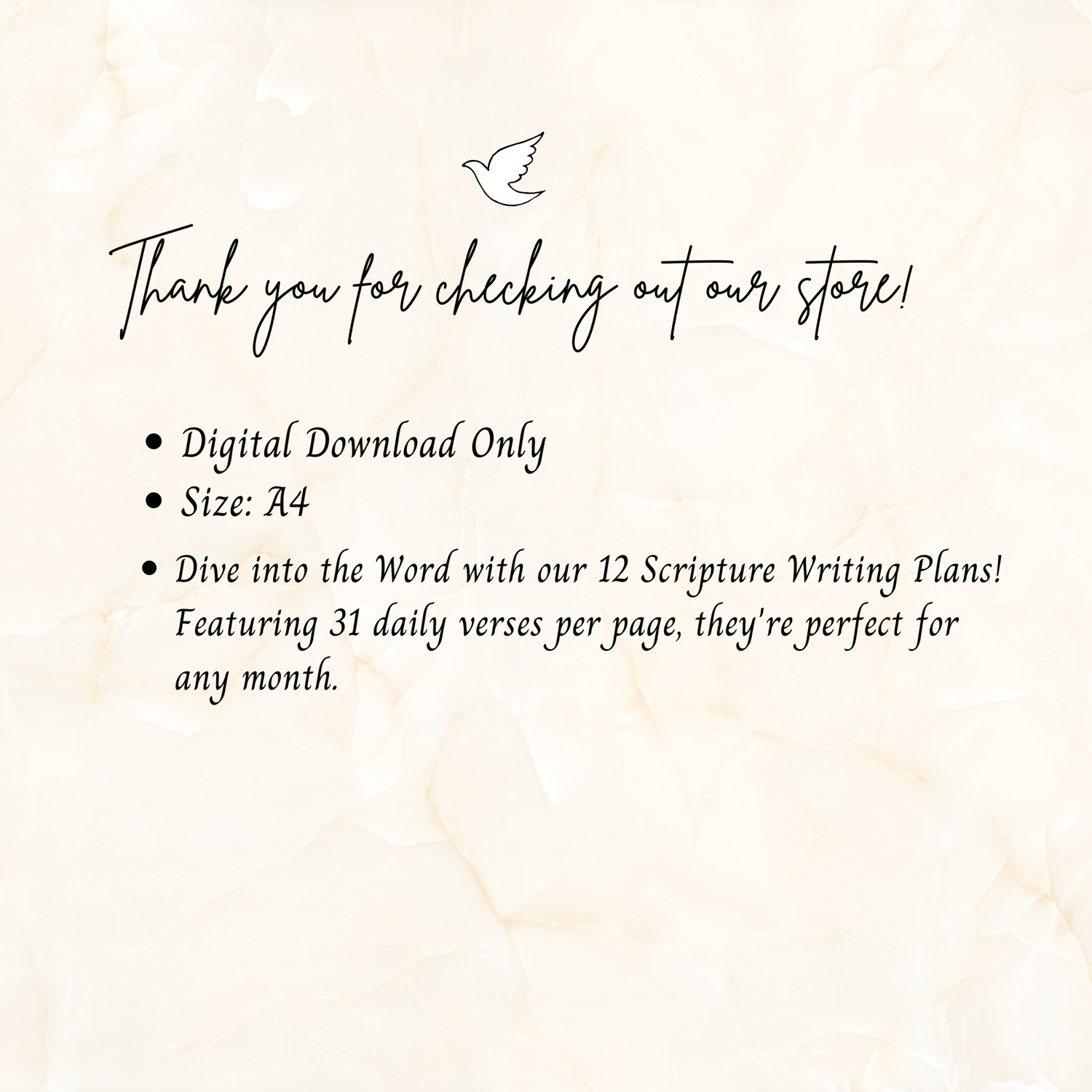 Tags: Scripture Writing Plan, Bible Writing Plan, Printable Devotional, Digital Bible Study, Faith Planner, Christian Journal, Daily Scripture Guide, Bible Verse Schedule, Religious Writing Plan, Spiritual Growth Printable.