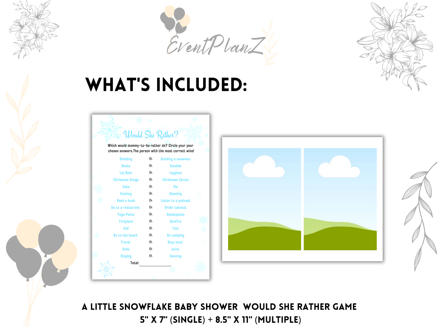A Little Snowflake Is On The Way Baby Shower Would She Rather Game | Christmas Gender Reveal Party | Canva Template | Printable Stationery