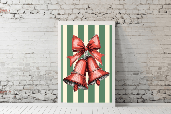 Add festive cheer to your home with this Whimsical Christmas bow, tree, and jingle bell print - featuring retro green stripes and charming support Christmas elements details. This cozy Christmas wall art brings a warm, nostalgic touch to your holiday decor, perfect for styling in your living room, entryway, or bedroom. A lovely printable gift idea, it’s ideal for anyone who loves colorful, coquette, or preppy Christmas aesthetics.
