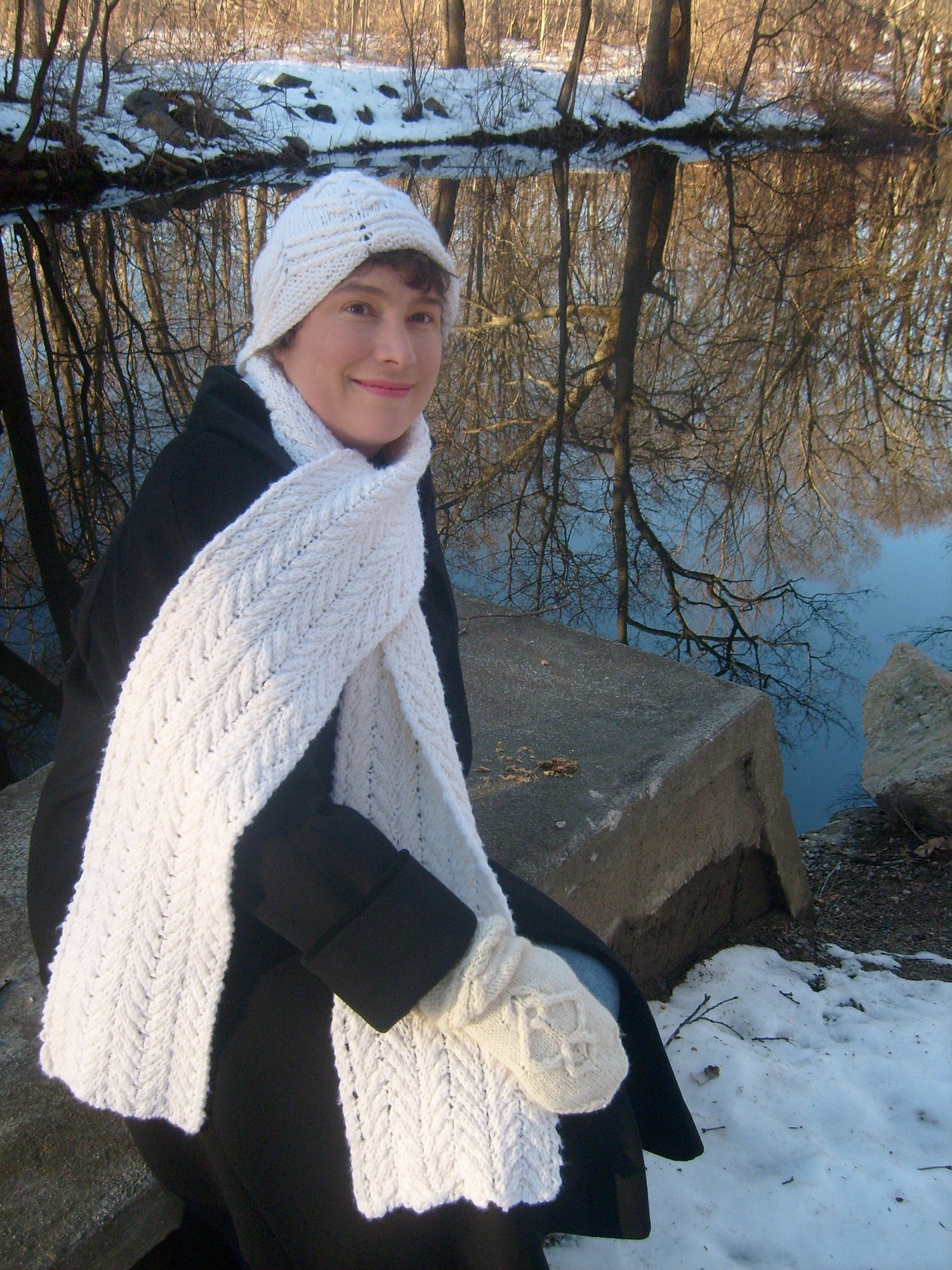 I broke the symmetry of increase direction in Row 5, because it is really hard to increase into a stitch that has just been cabled, or decreased away. It doesn’t change the appearance of the fabric much. When I blocked the scarf, it grew lengthwise, and wearing made it grow even more because of the weight of the scarf. It might behave differently on a yarn that has not been treated for super-wash; but if you are short on yarn, a short scarf might not be a