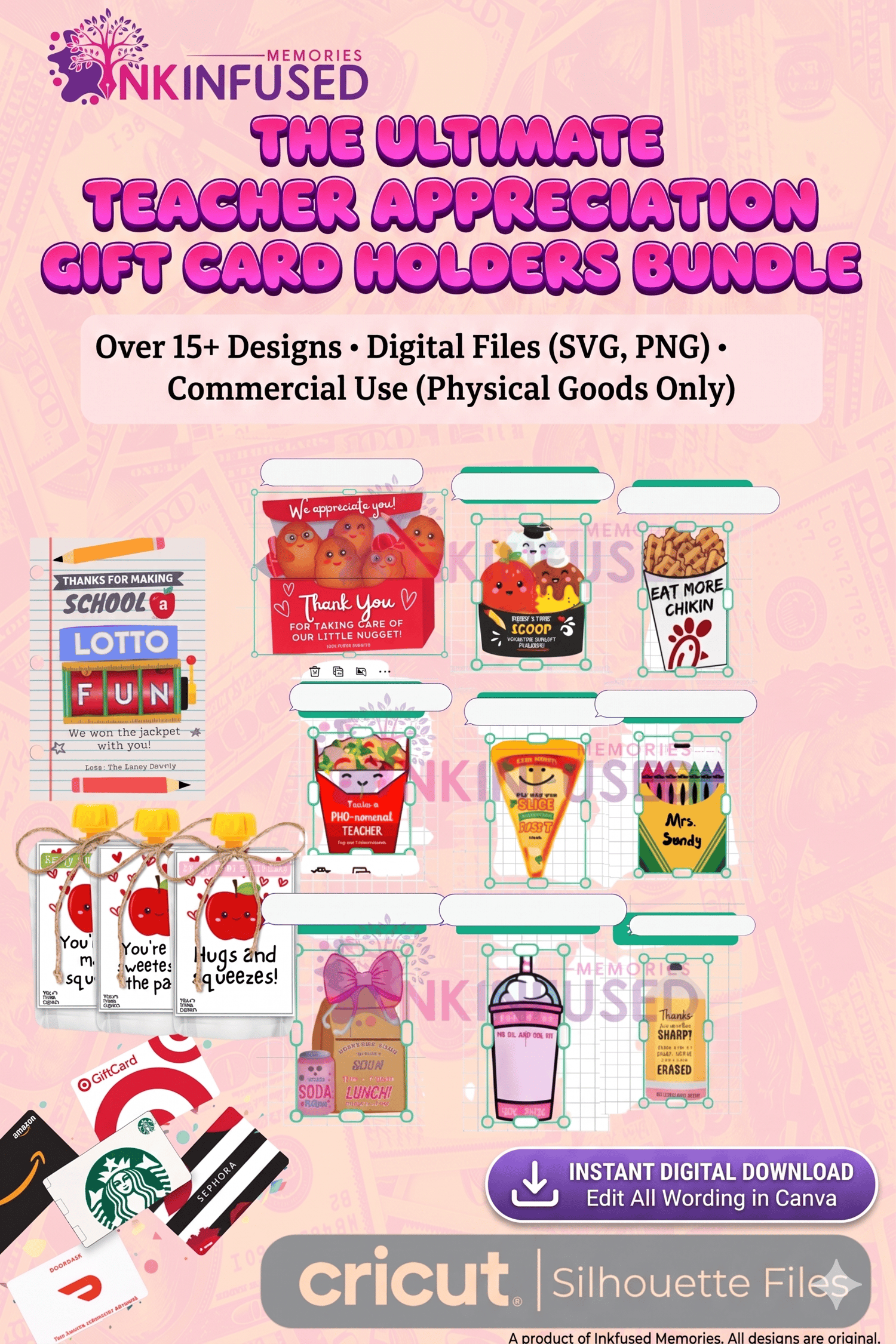 Why you’ll love it: ✅ 15+ Unique Designs: From "Nuggets" to "Lotto Fun" and "Chick-fil-A" vibes. ✅ Edit in Canva: Change the names and wording in seconds! ✅ Any Machine Works: Includes SVG for Cricut/Silhouette and PNGs for easy Printing & Cutting. ✅ Budget Friendly: One bundle covers every teacher, coach, and bus driver on your list!