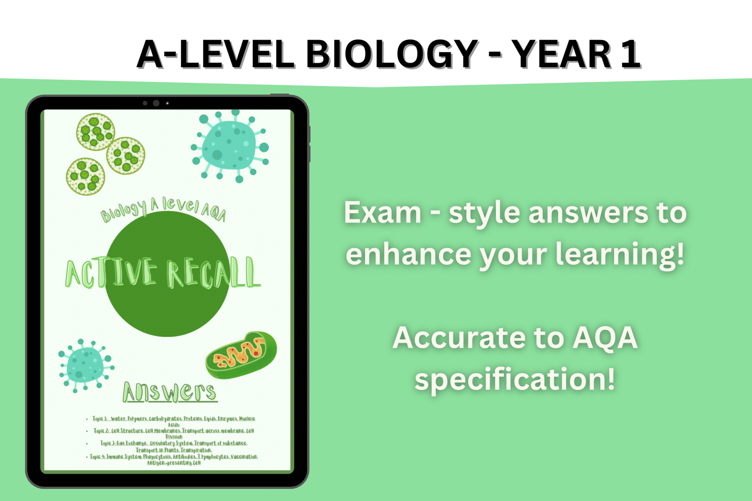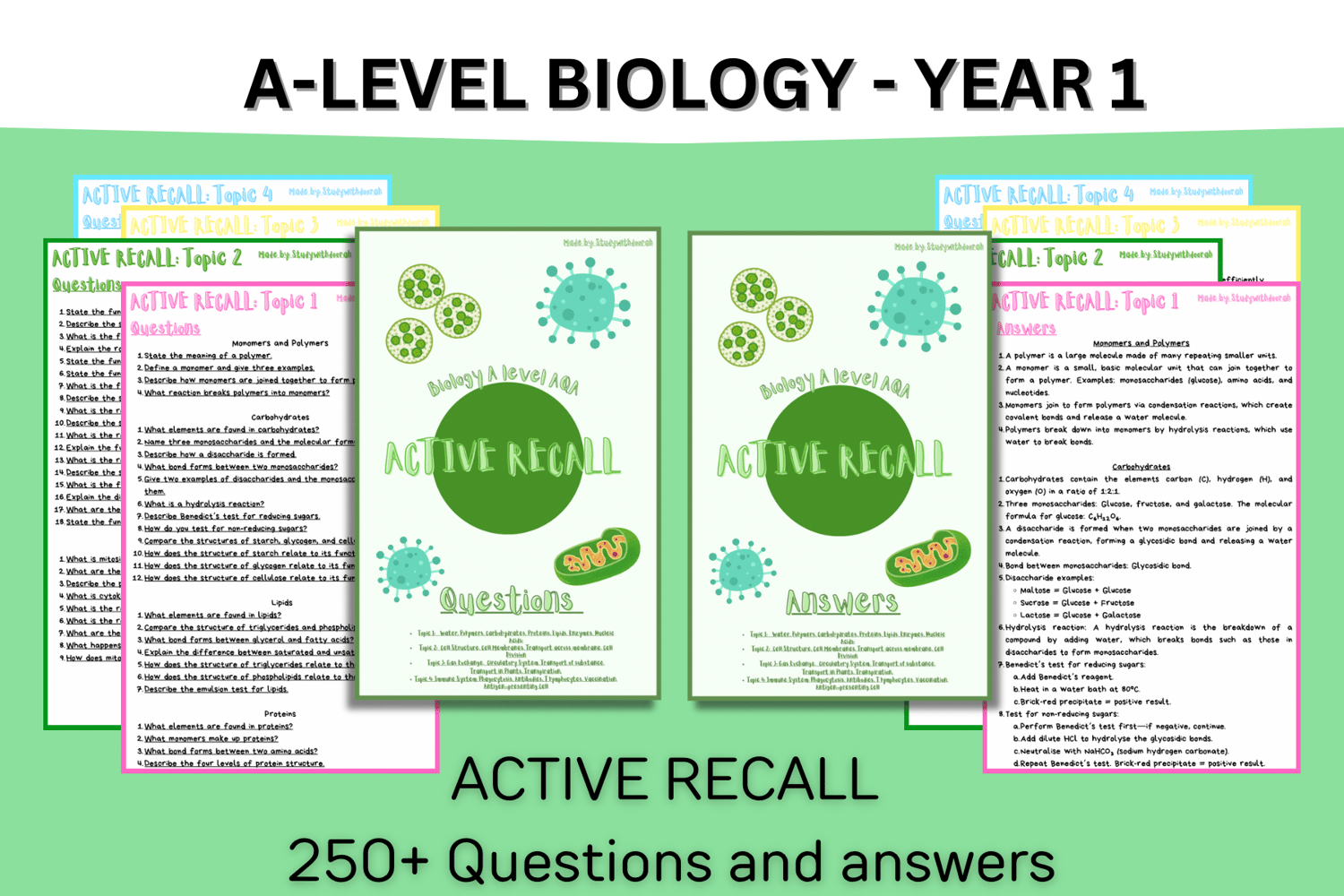 Boost your Biology revision with this comprehensive active recall resource designed for AQA A-level students. With over 30 pages and 250 questions covering Year 1 topics 1-4, this guide offers a perfect balance of digital and printable formats. Test your knowledge, reinforce key concepts, and prepare confidently for your Paper 1 exam. Whether you prefer to study on-screen or on paper, this resource is your ultimate tool for mastering the material and excelling in your exams