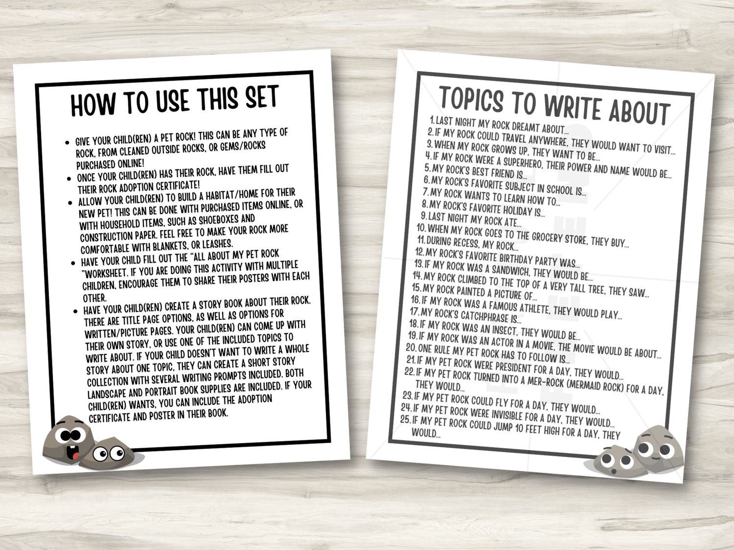 This 35 page printable allows children to bring their imaginative world to life! Watch them have a world of fun as they adopt a pet rock, create an informative poster about it, and then write a story (or many stories!) about their new pet!