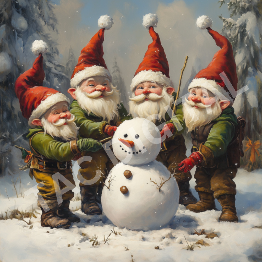 The cutest gnomes ever! are working on building a Snowman together. They are AI graphics, 3125x3125 in size and 300 dpi. Created with love to share joy with Gnome lovers everywhere.