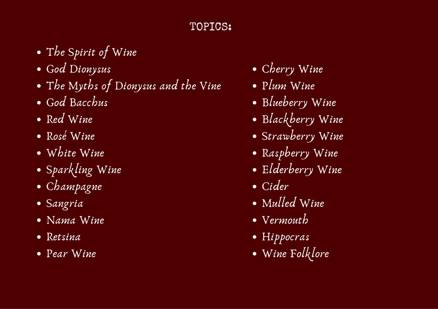 Explore the lore of Dionysus, Bacchus, and the sacred spirit of wine, from Red and Rosé to Cider, Vermouth, and Hippocras.