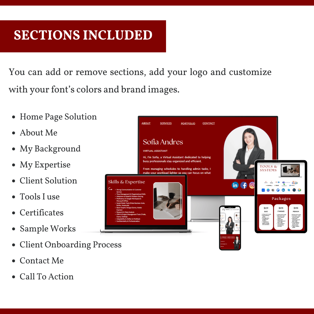 Pages: Home, About, Services, Packages, Testimonials, Portfolio, Tools, Experience, Certificates, Skills, How I Work, Contact, CTA