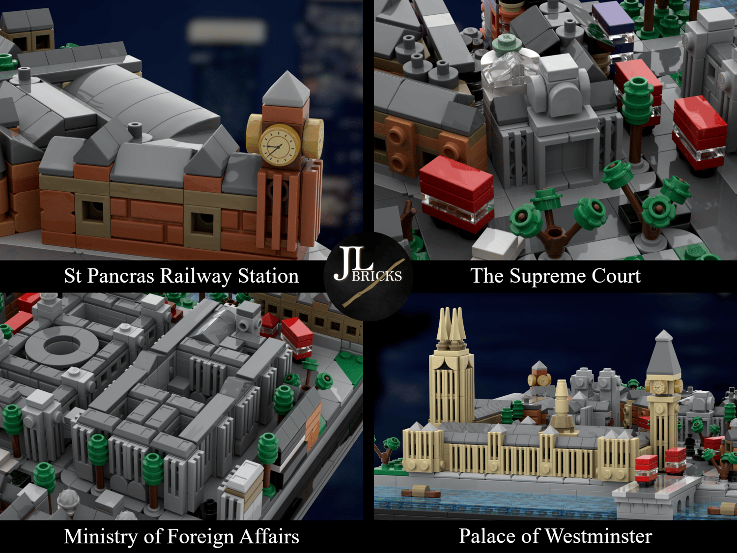Apart from that the model is a detailed and mostly accurate recreation of Westminster (London), including the Westminster Palace, Westminster Abbey, the Parliament Square Garden with a Sir Winston Churchill statue, His Majesty's Revenue and Customs, the Foreign, Commonwealth and Development Office, the Cenotaph, King Charles Street Arch, Downing St, the Supreme Court and the Norman Shaw Buildings (formerly New Scotland Yard). Furthermore parts of the Westminster Pier and St James's Park can be seen. The facade covering Platform 9 3/4 is that of St Pancras Station. However, due to space constraints, it wasn't possible to recreate the entire building and it couldn't be placed at its real-life location.