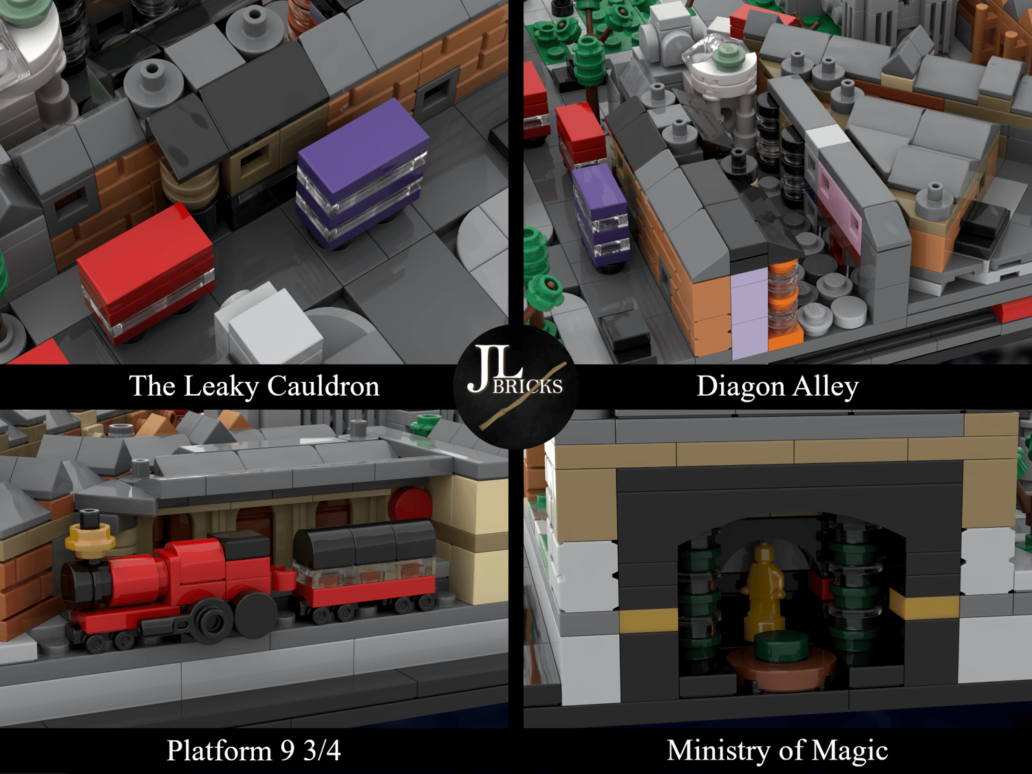 Concerning Harry Potter references: the model includes the Ministry of Magic with a red telphone box in front, Diagon Alley, the Leaky Cauldron, 12 Grimmauld Place, Platform 9 3/4 with the Hogwarts Express and the Knight Bus.
