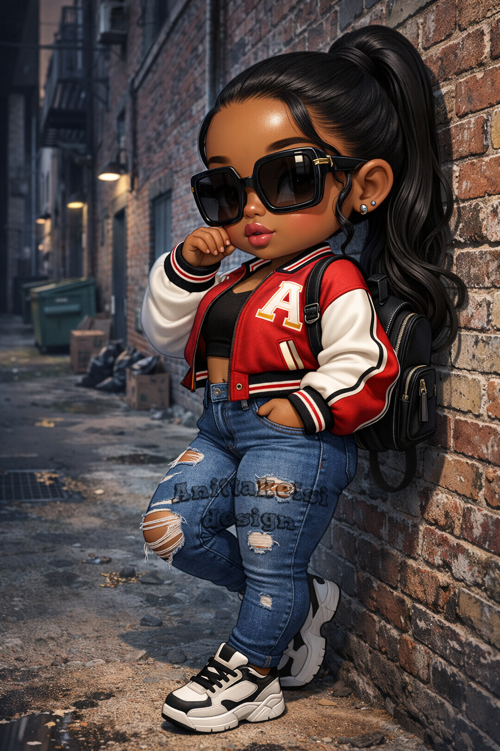 A super cute melanin chibi girl rocking a bold urban street style look. She features smooth glowing melanin skin, glossy lips, oversized stylish sunglasses, and a sleek high ponytail. Her outfit includes a trendy red varsity jacket layered over a crop top, ripped denim jeans, chunky sneakers, and a mini backpack for the perfect streetwear vibe. Set against a gritty alley background, this fashionable chibi captures confidence, attitude, and modern urban style. Perfect for digital art lovers, chibi collectors, and creators who love stylish melanin characters. ✨🖤