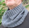 This cowl is designed to suit everyone. The textured pattern is understated but detailed enough to be interesting, and the deep moss ribbing ensures that cold winds are kept firmly away from the neck. It can easily be turned into a deeper cowl/snood by adding more vertical repeats of the pattern; it is written for knitting in the round. It was designed for someone who cannot tolerate wool next to the skin, and the yarn suggestions are both cotton blends that give excellent stitch definition.
