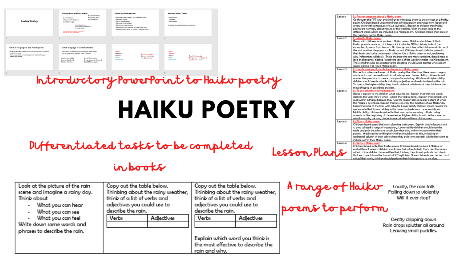 6 Lessons based on Haiku poetry. This unit of work contains an introductory PowerPoint, differentiated tasks to be completed in books and a range of poems to perform.