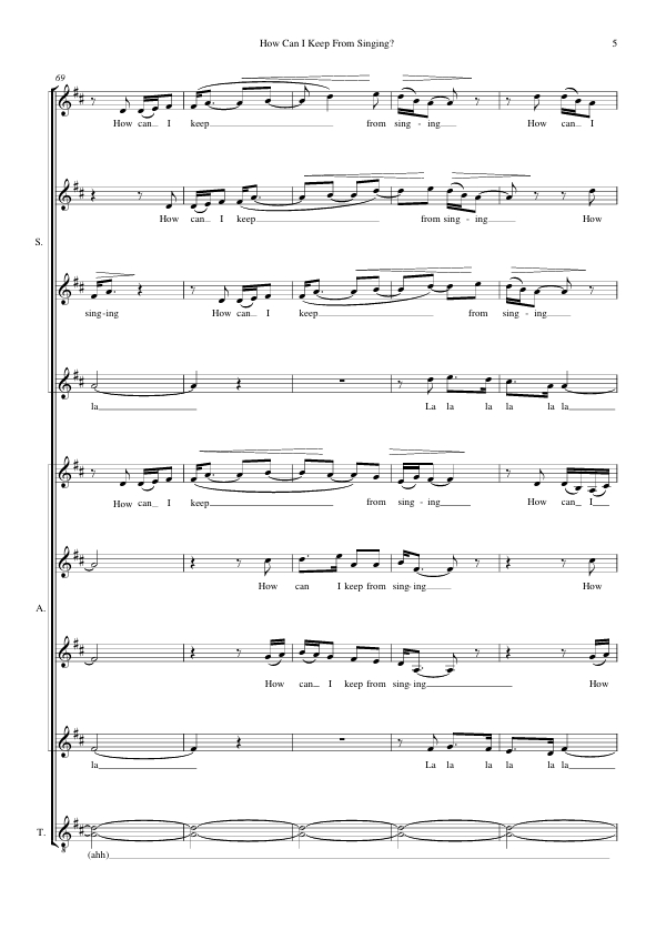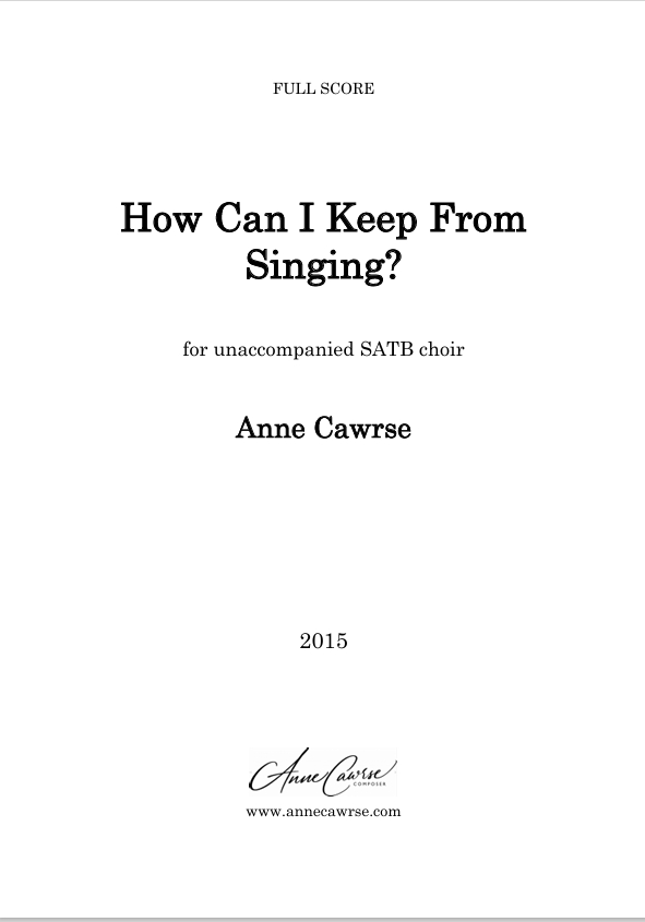 How Can I Keep From Singing was written for the Adelaide Chamber Singers‐ an incredible group of people who can sing rather well‐ and is a celebration of song, the beauty of music and the joy of singing together. One by one the women's voices come together in echoes and duets of a single refrain. After a time they are joined by the men, and together the group journey through moments of uncertainty, fear and hope before eventually returning to celebration. The question asked in the opening lines is in fact no question at all; throughout the journey, the music, the dance and the singing must go on.