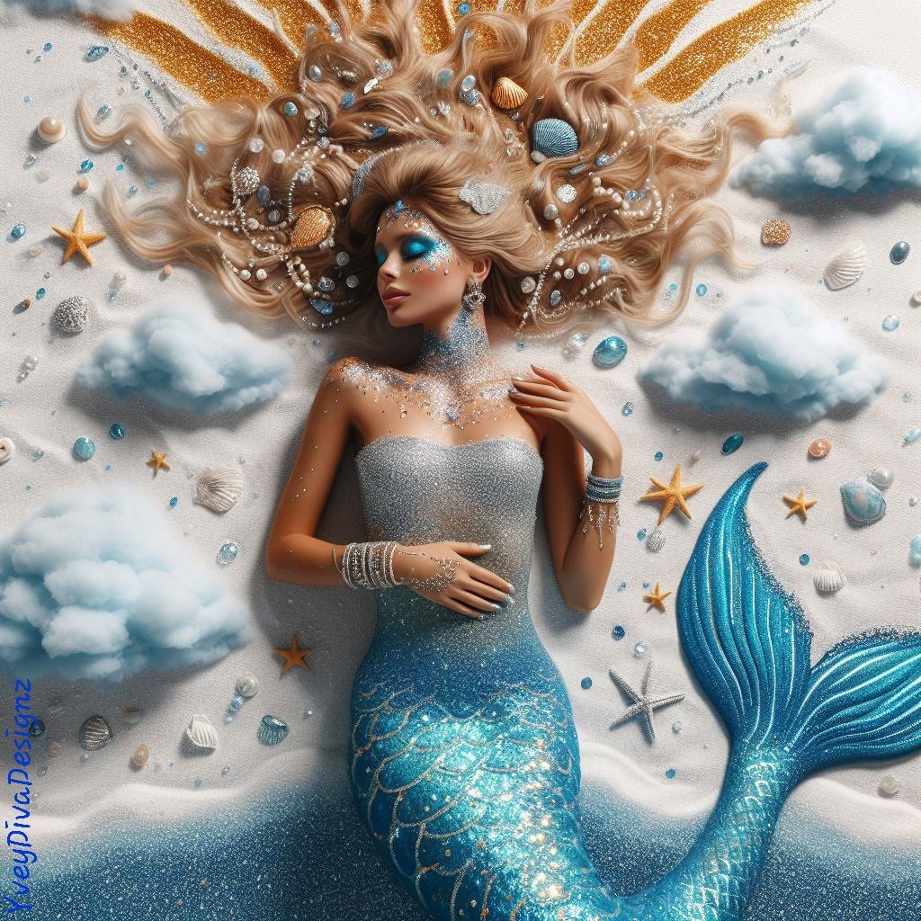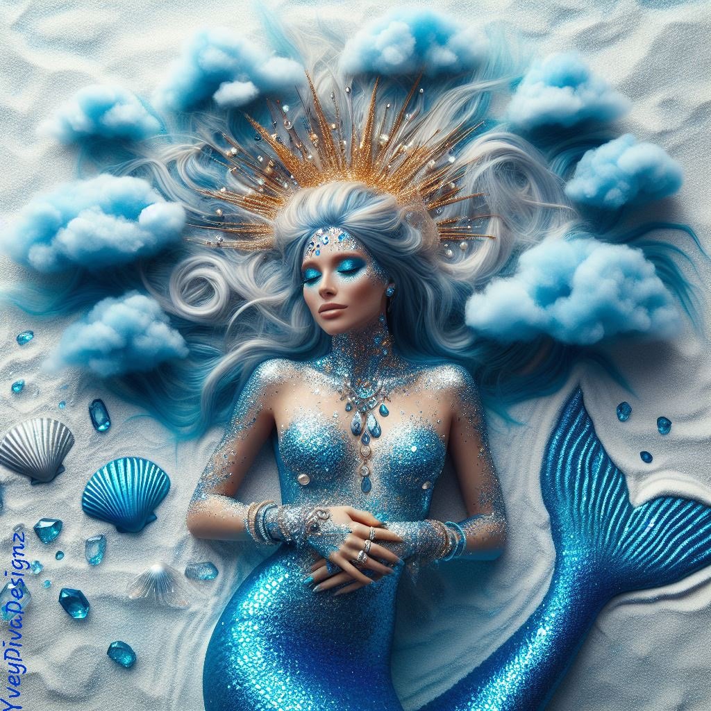 Amidst the tranquil embrace of floating blue clouds, three ethereal mermaids with porcelain skin and shimmering blue scales rest on a sunlit beach. Their golden locks cascade like liquid sunlight, adding a touch of warmth to the serene azure scene. This captivating trio beckons you into a dreamscape where fantasy and nature unite.