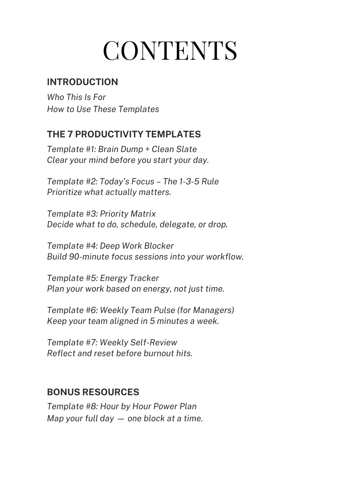 This PDF playbook gives you 7 plug-and-play templates to help you get clear, get focused, and get sh*t done — even on your worst day.